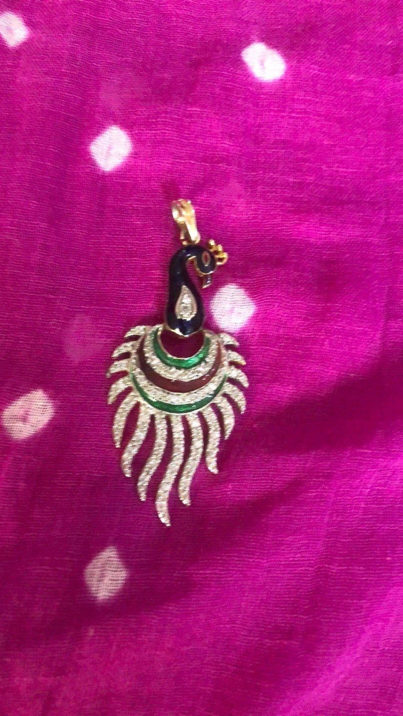 Gold-tone peacock pendant with clear stones. It features a green, red, and brown enamel design.