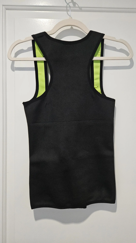 Black and lime green, Nebility Neoprene Waist Trainer Corset Sweat Vest Weight Loss Body Shaper Workout Tank Tops Women. Has a zipper in the front. Never used.