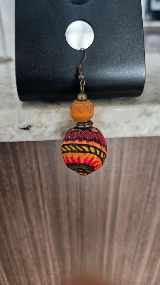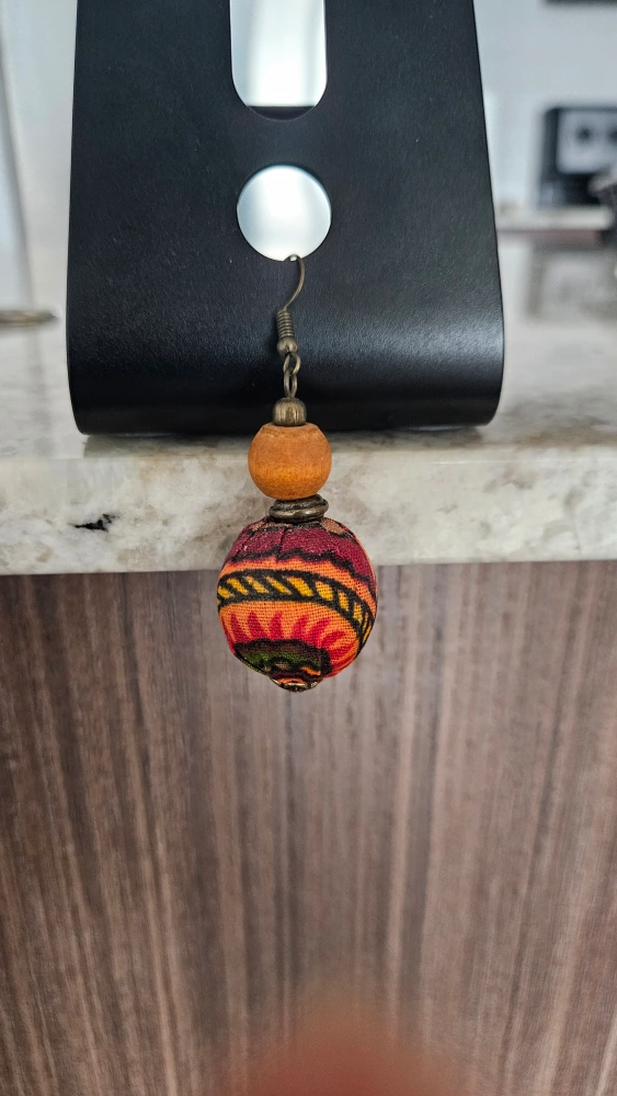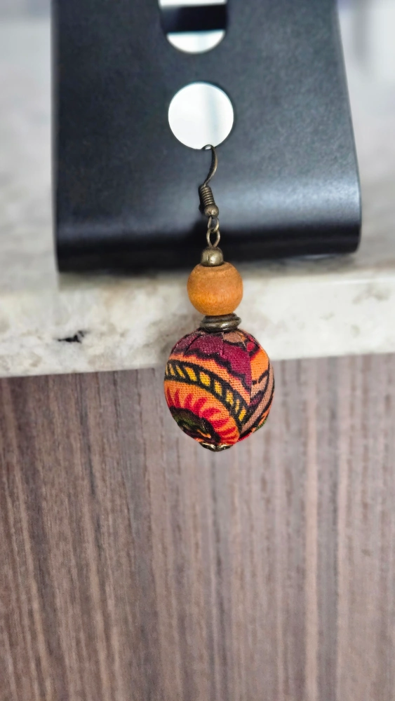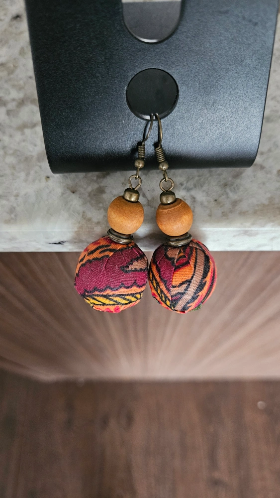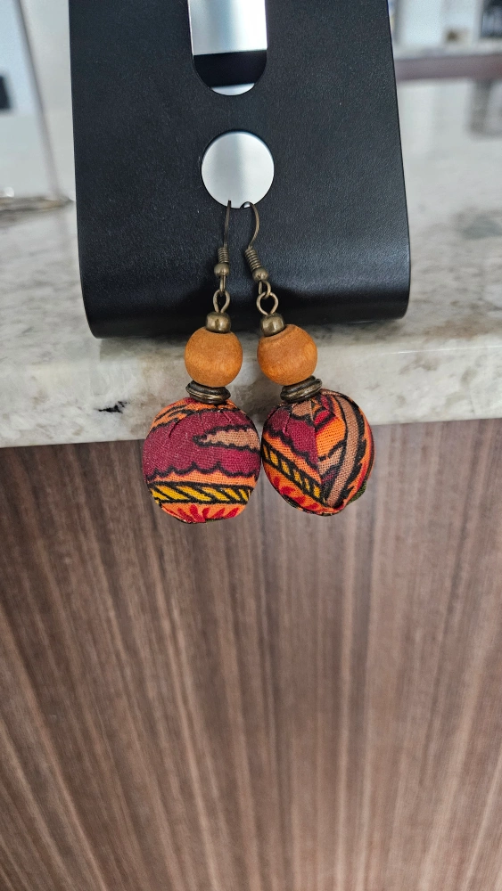 Fabric and wood dangle earrings with colourful orange pattern. African print.