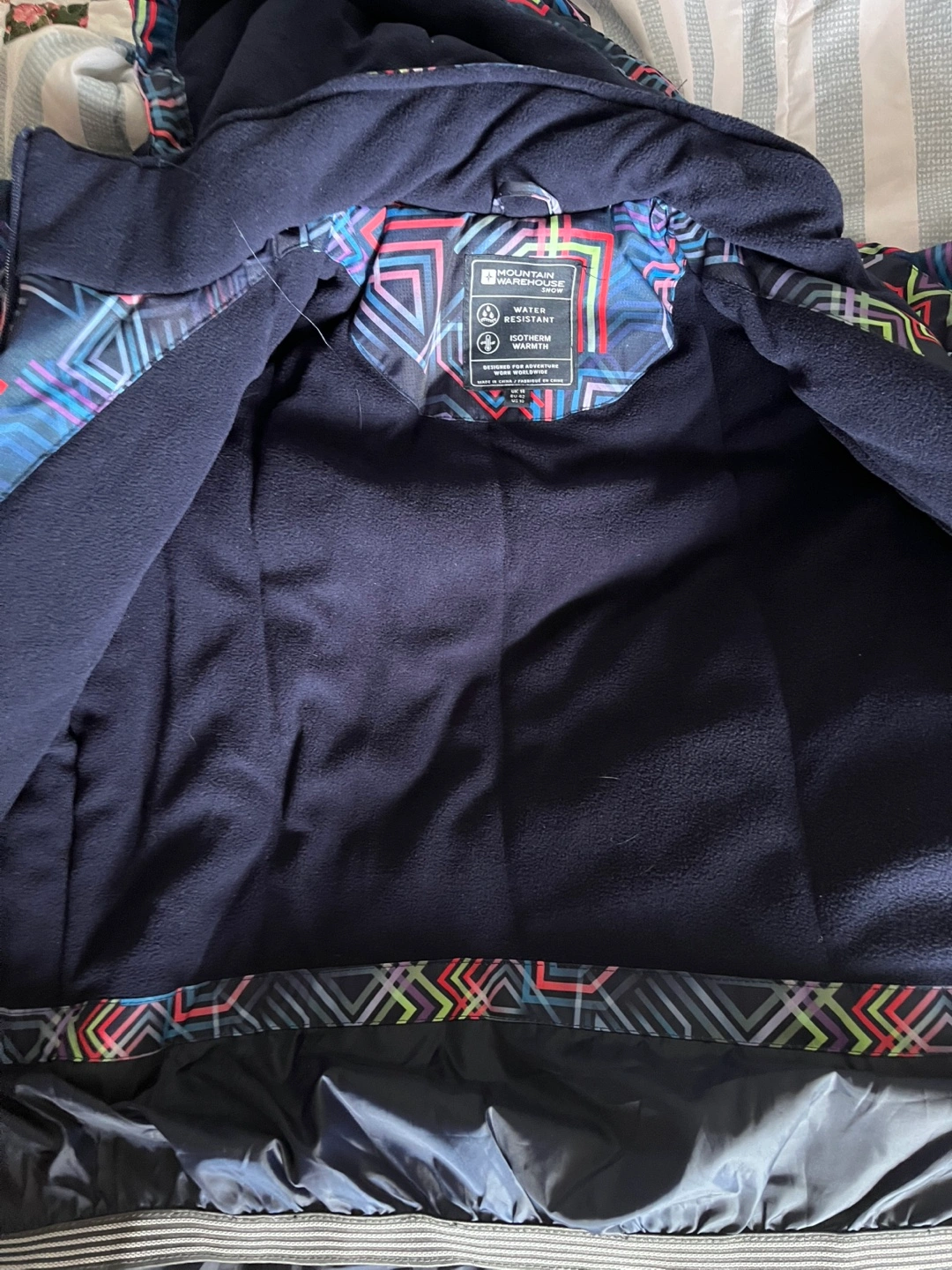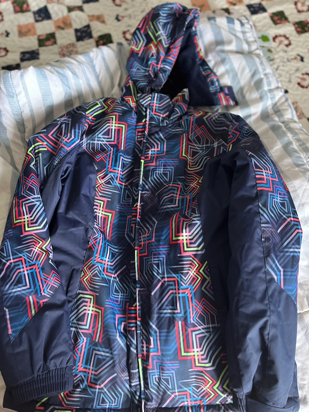 Blue winter jacket with a colourful geometric pattern. Fleece lined, hood and zipper closure. Great for keeping warm in the winter.