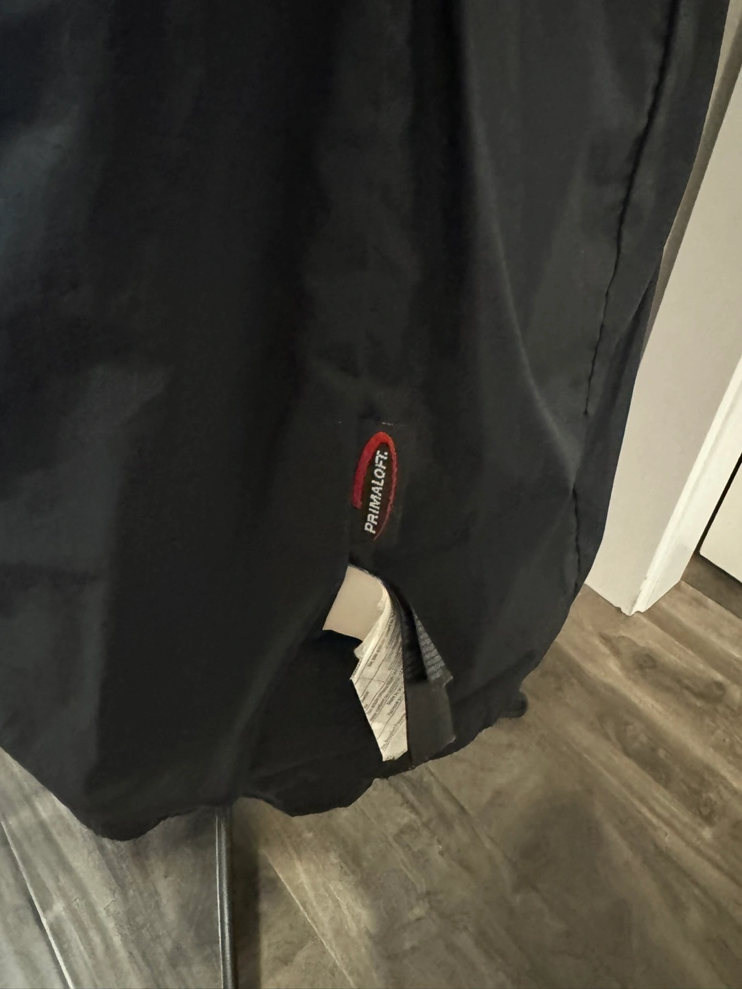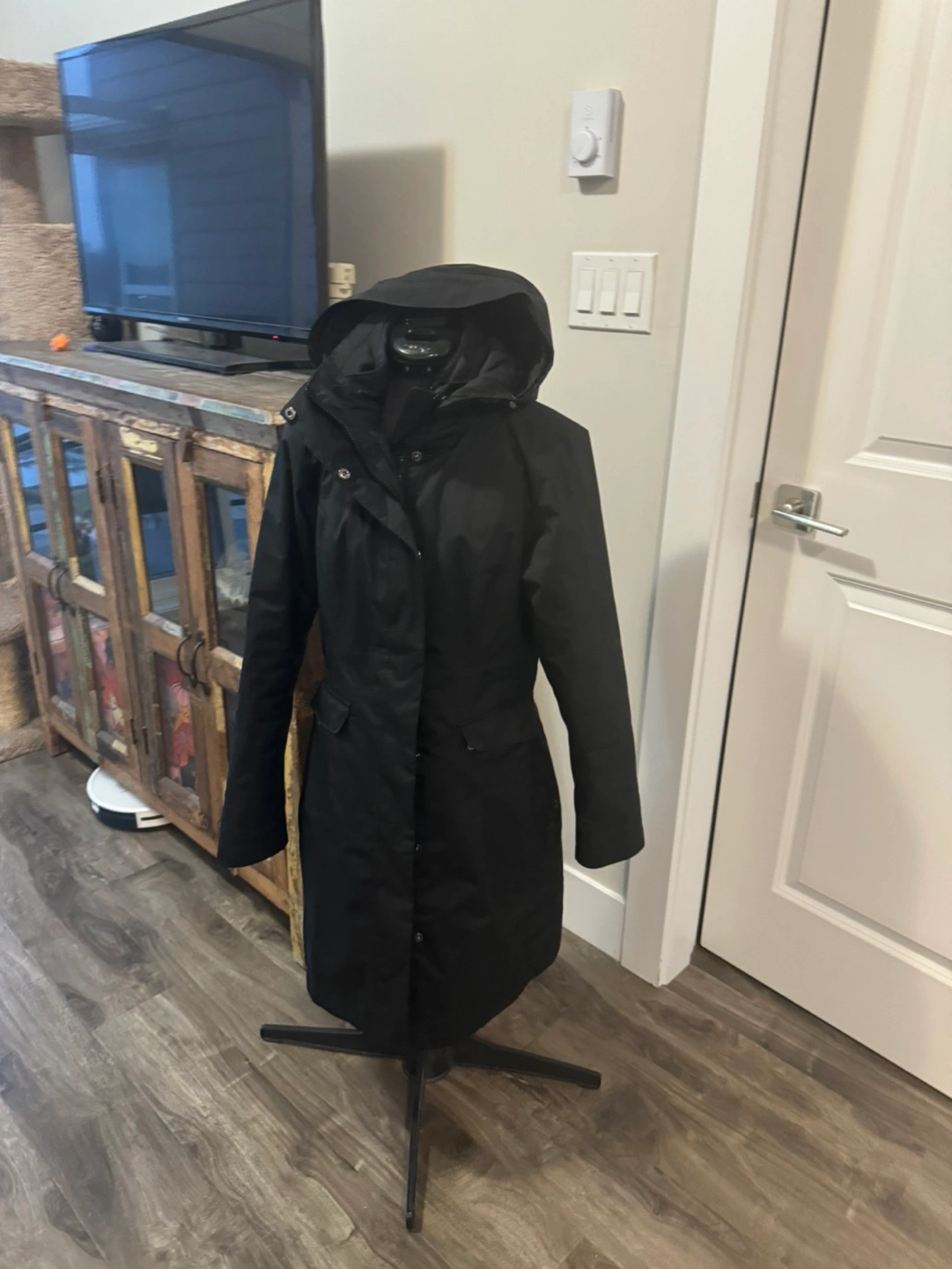 Black winter jacket with a hood. Long, with a zipper and button closure. Has removable inner padded piece & outer shell. Water resistance. Good condition no longer fits me. Will not fit a medium