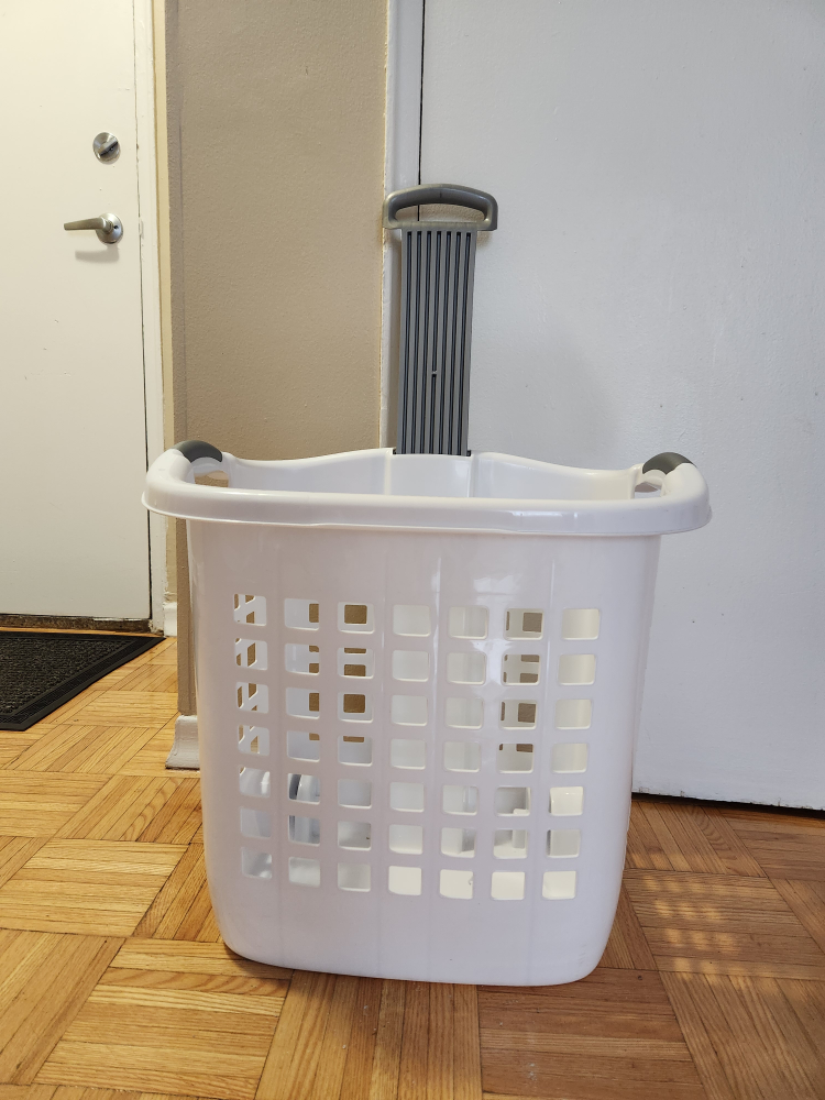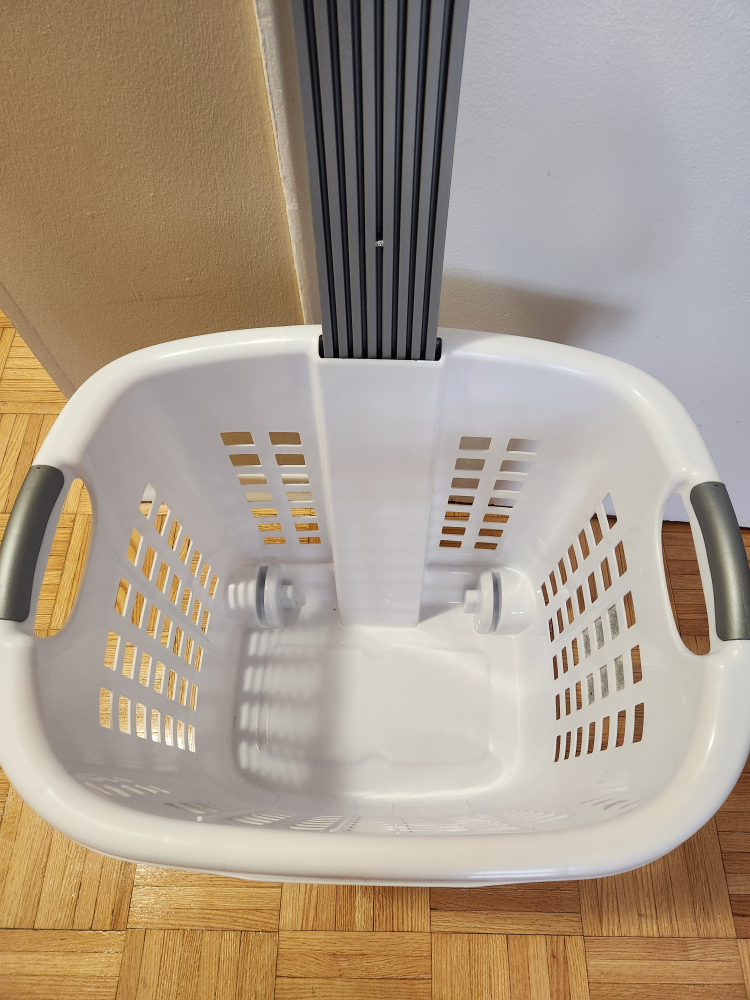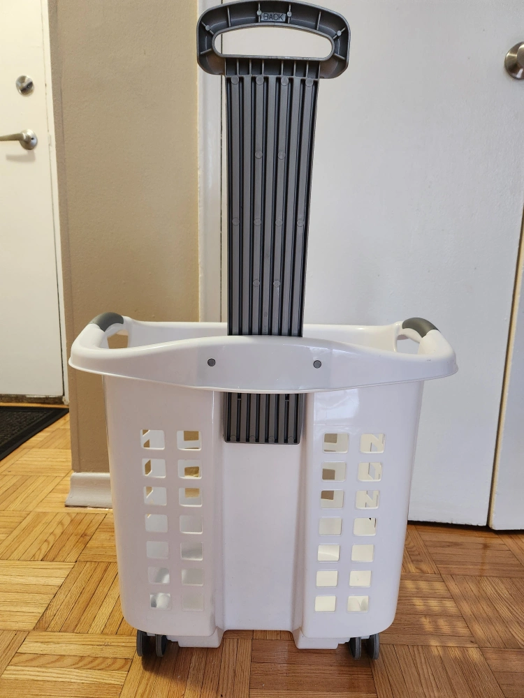 White laundry basket with wheels and retractable handle. 62L capacity.