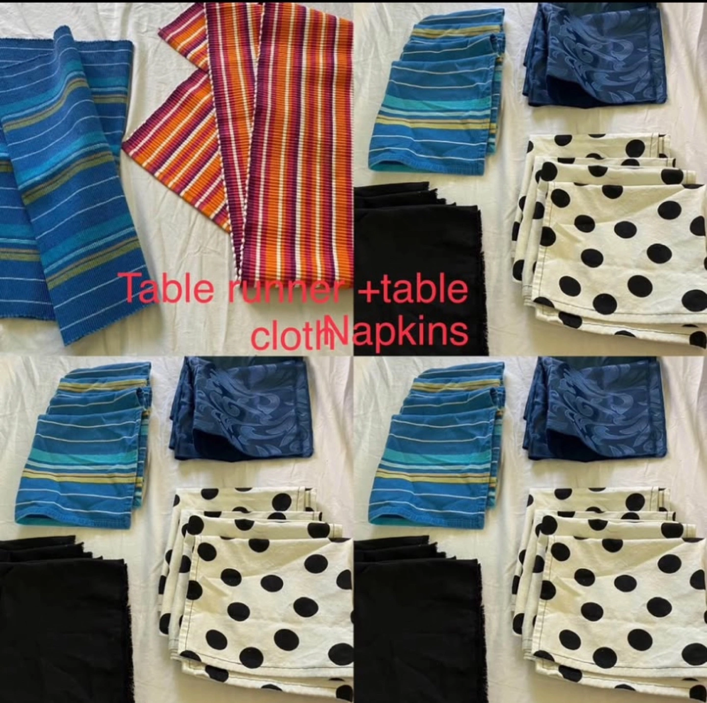 Two table runners, one orange and red and one blue. Six blue striped napkins, six black napkins, six white napkins with black polka dots, and six blue napkins with a floral pattern.