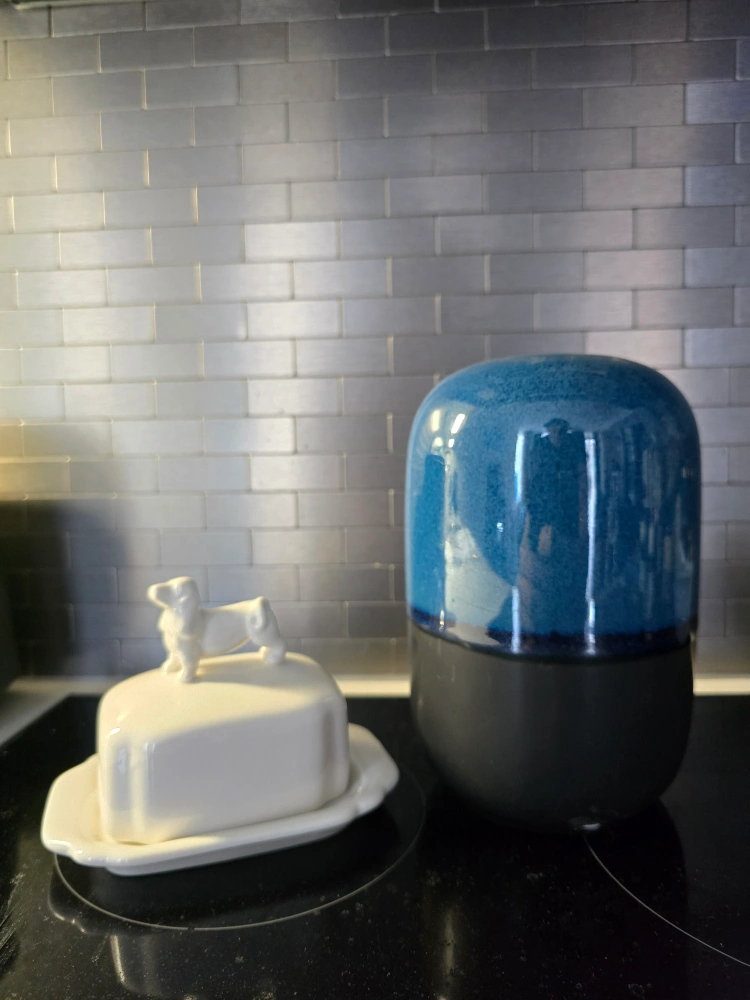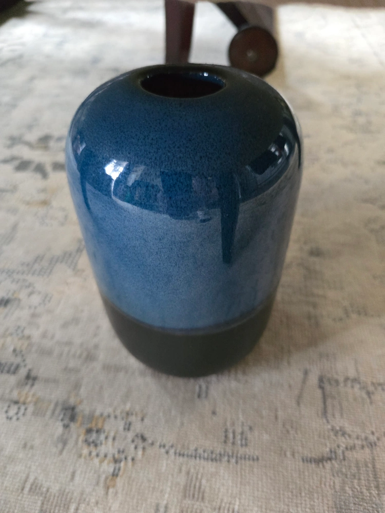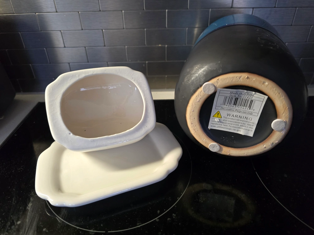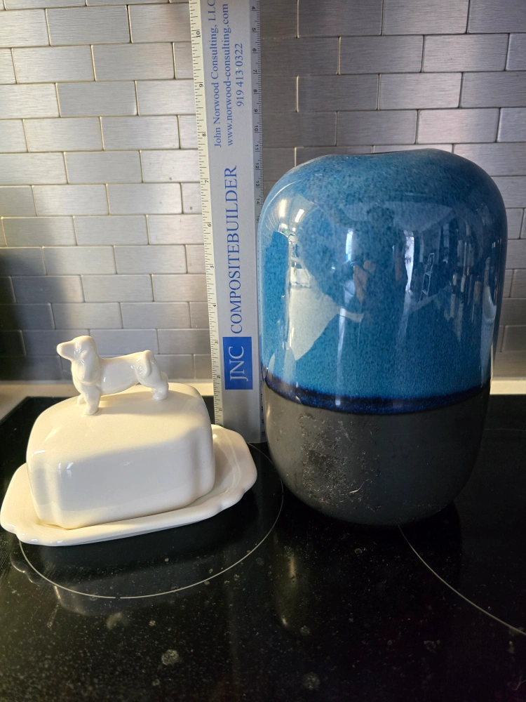 365Ceramic vase with a blue glaze and black bottom. Approximately 8 inches tall. Small butter dish with a dog handle. each item is just 5$