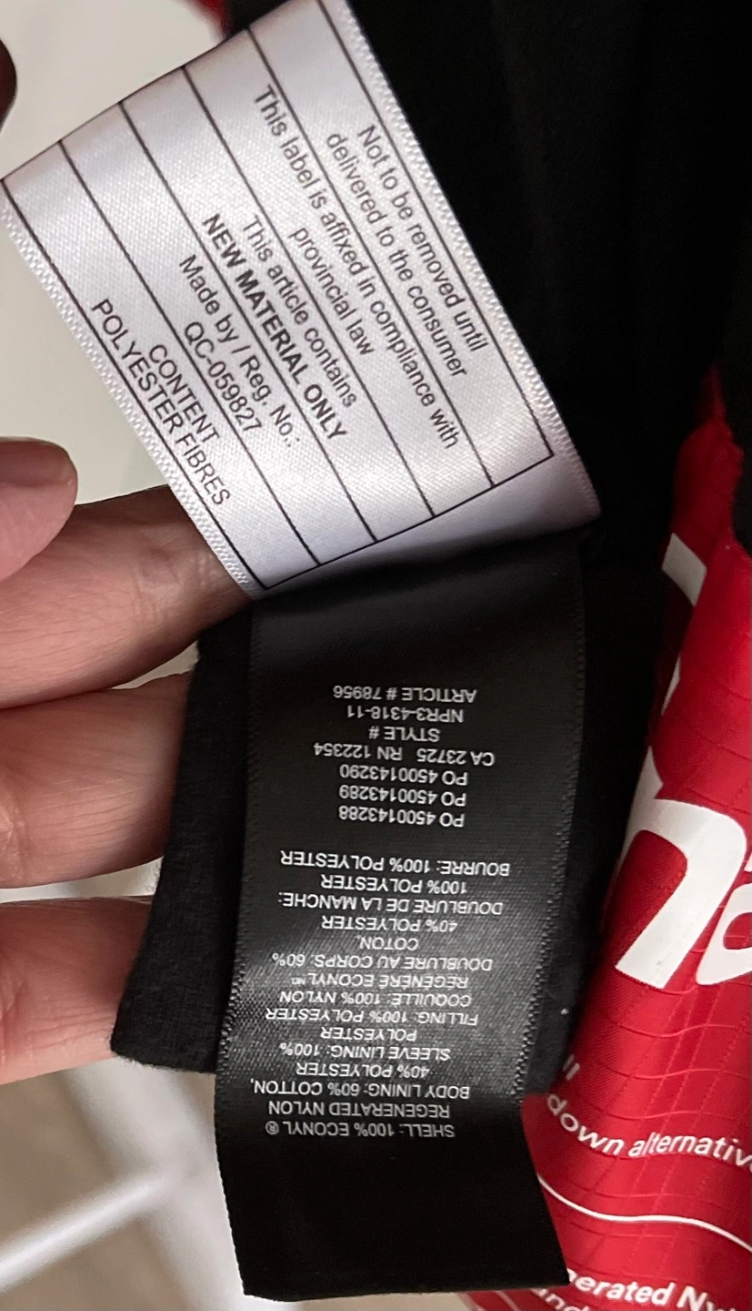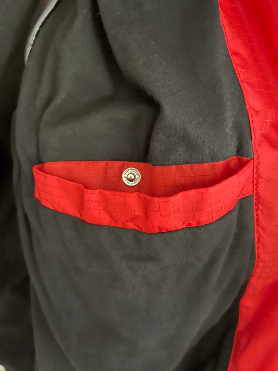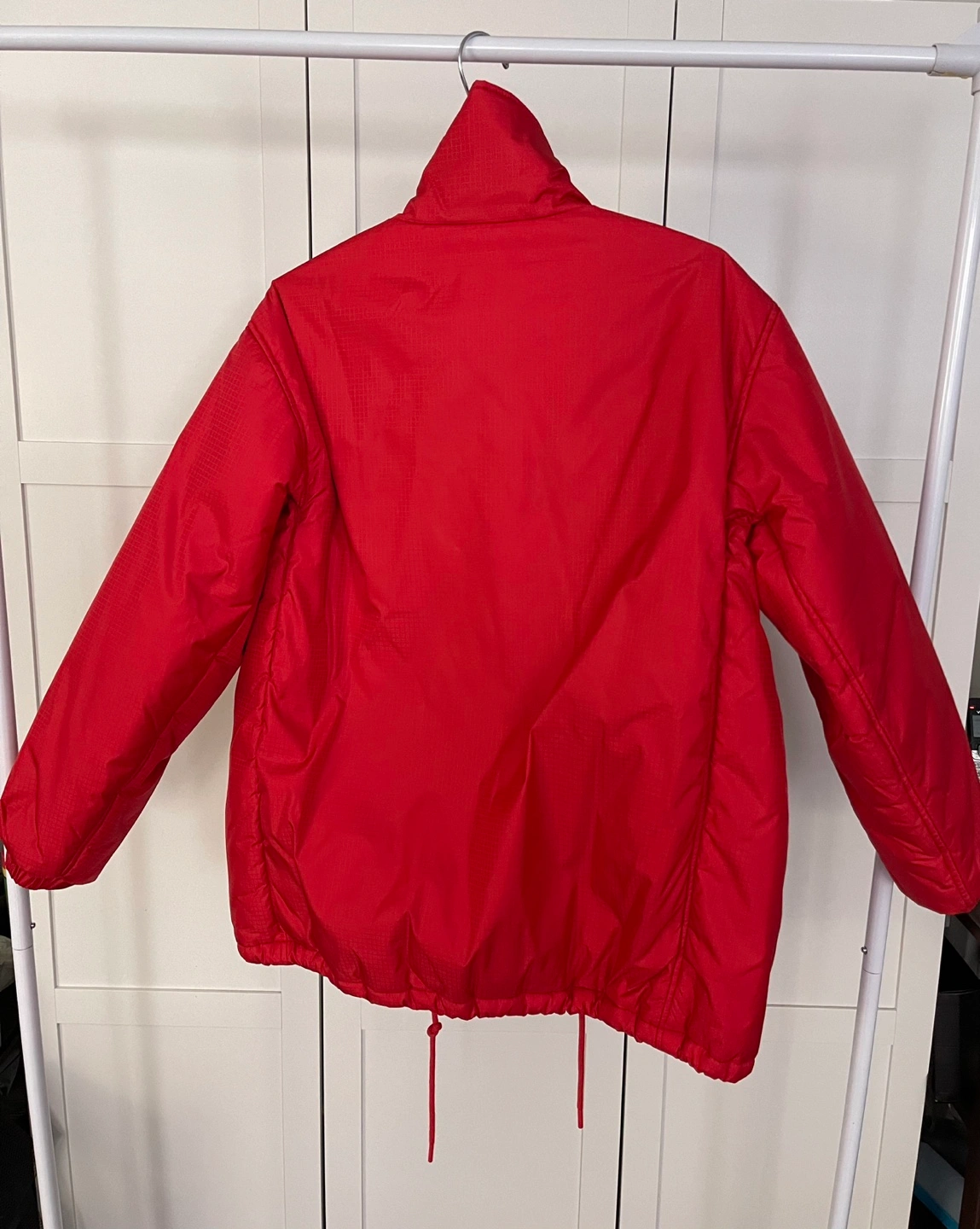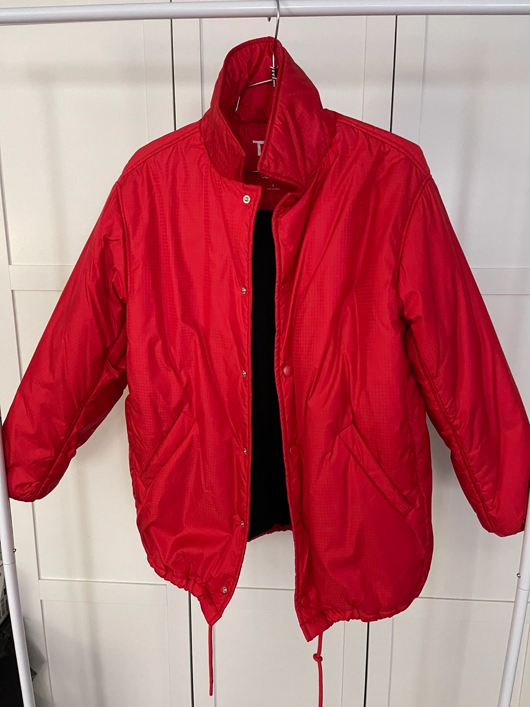 Red puffer jacket with a high collar and snap buttons. The jacket has a drawstring hem and two pockets.