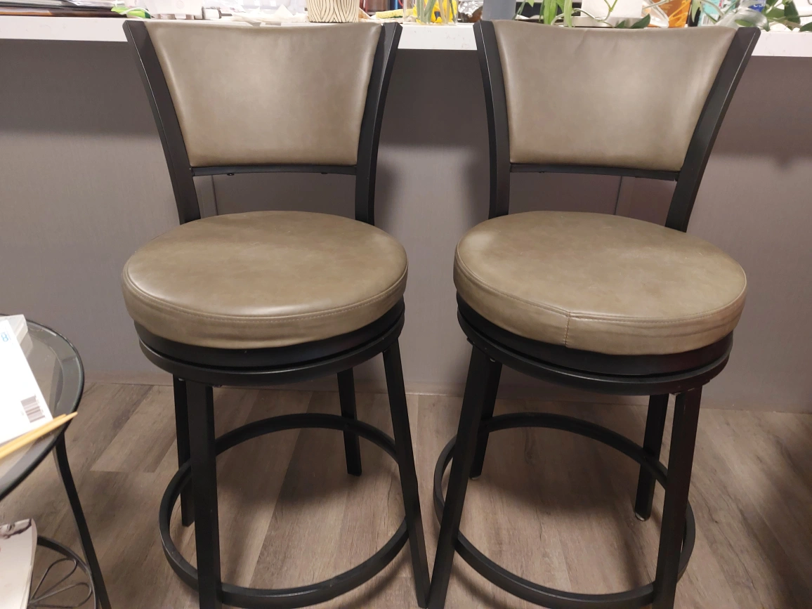 2 breakfast counter stools. Black metal frame, vinyl seats, swivel all the way around. 2ft to top of seat. Used one once. I moved and I don't need them anymore.