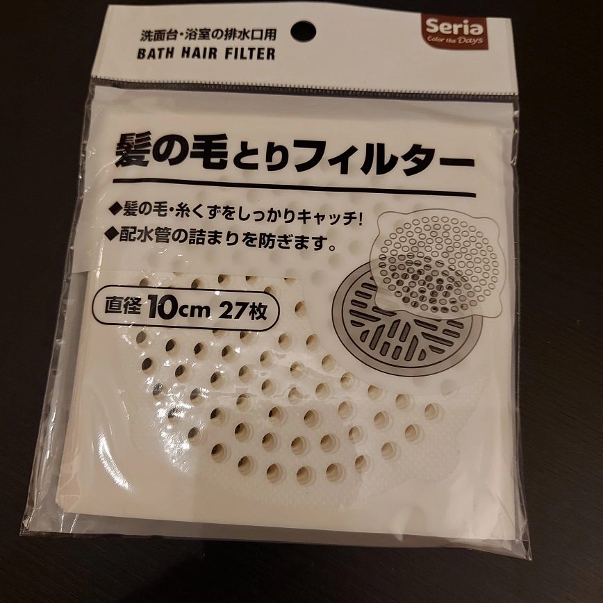 Bath hair filter. 10cm diameter. These are disposable. I used one and though it sticks well it doesn't work for my shower. 26 left in package.