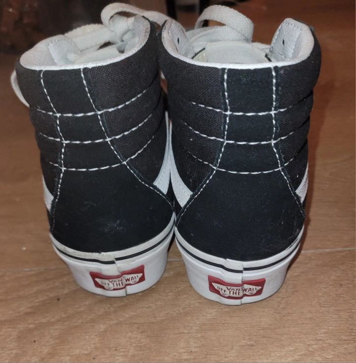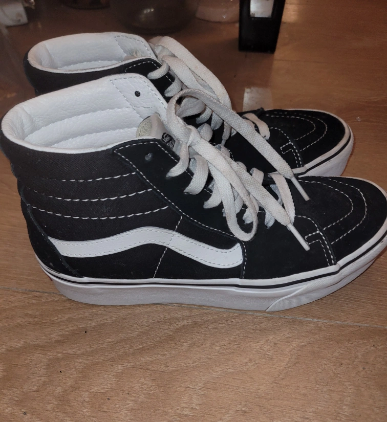 Black high top Vans platform sneakers with white laces and a white stripe. (Unisex) Size Men's US 5.5, Women's US 7 **** Cash Only **** **** Pickup Only **** **** No E-transfers **** **** Serious Inquiries Only/ Serious Offers Only **** **** No Returns/ No Exchanges ****