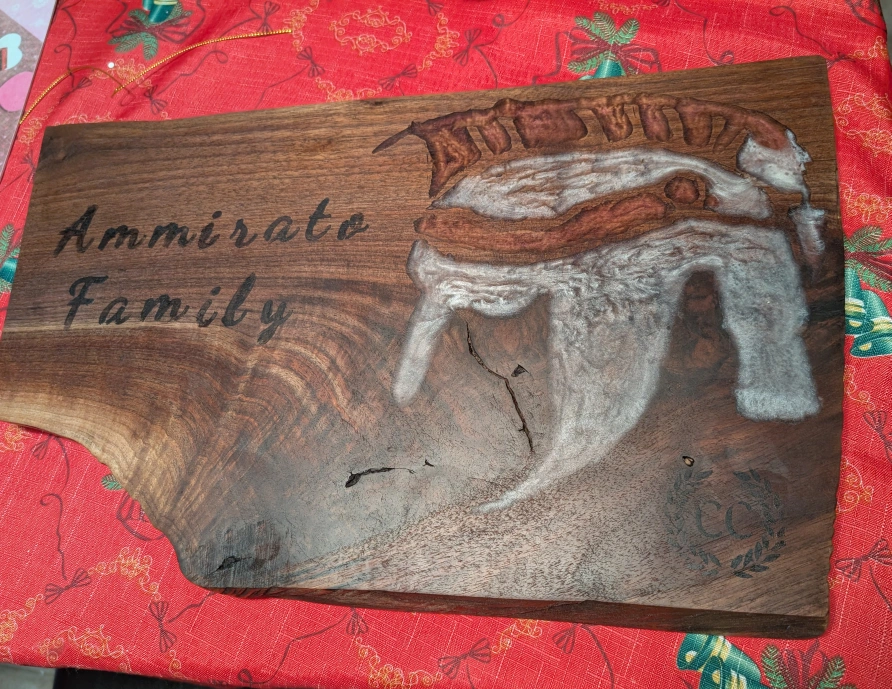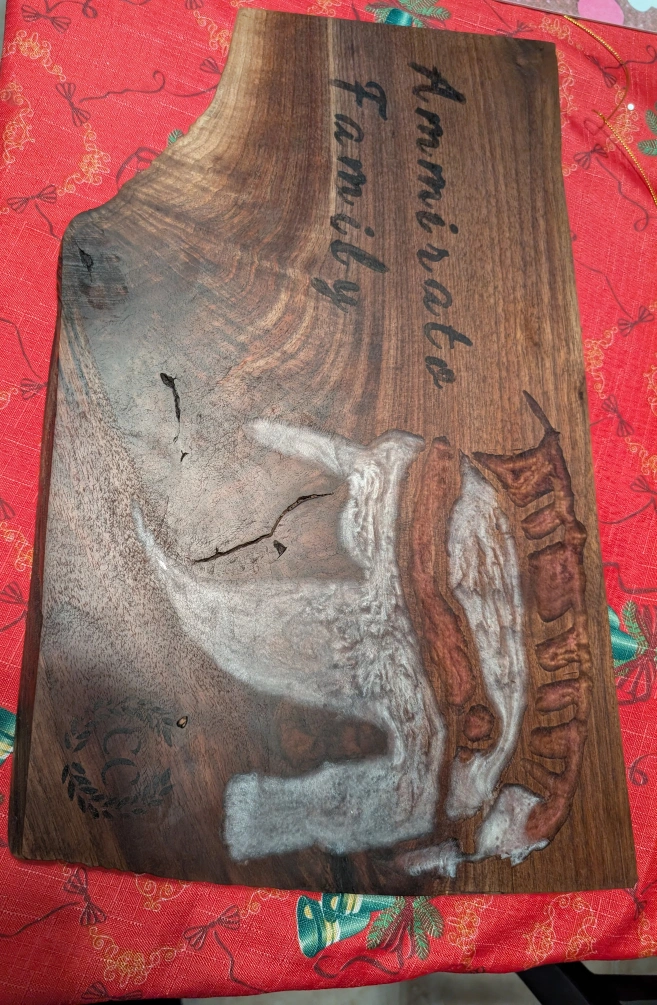 Personalized wooden serving board with a unique epoxy design. The board is made from walnut wood. Feel free to contact for your own personalized piece.