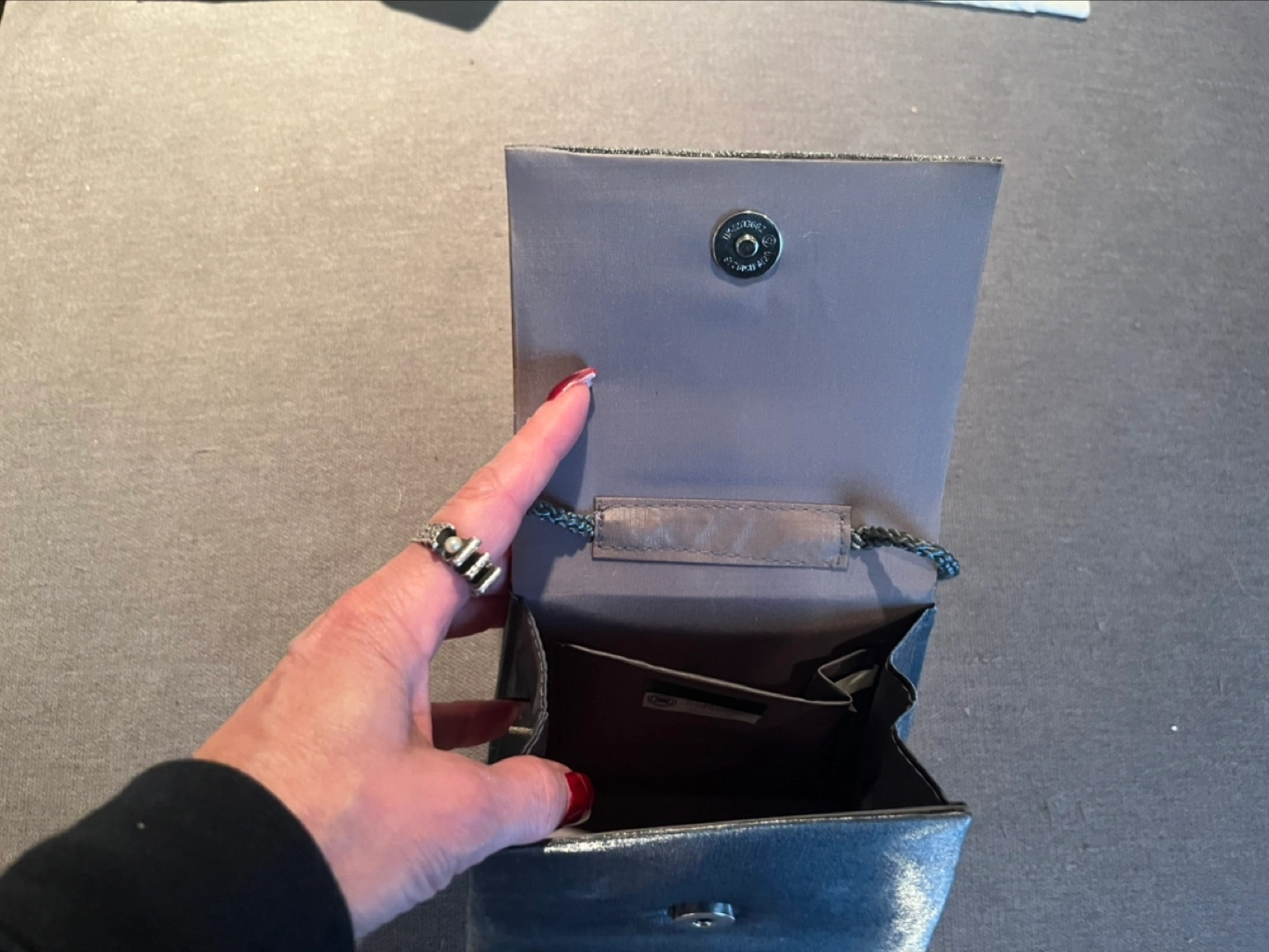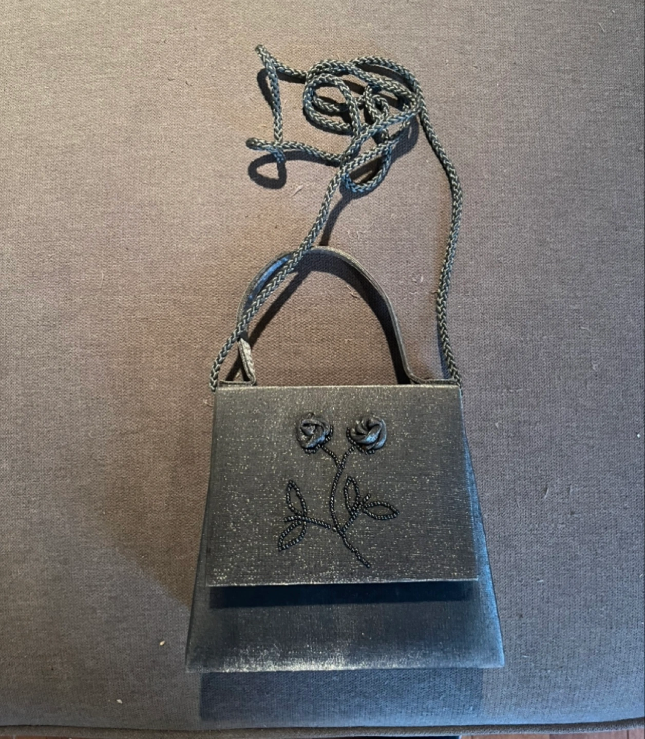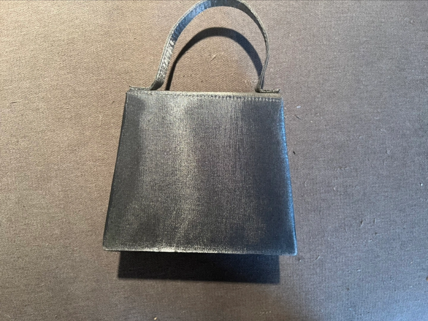 147Small silver evening bag with a rose design on the front. Has a long strap and a short handle. Perfect for special occasions.