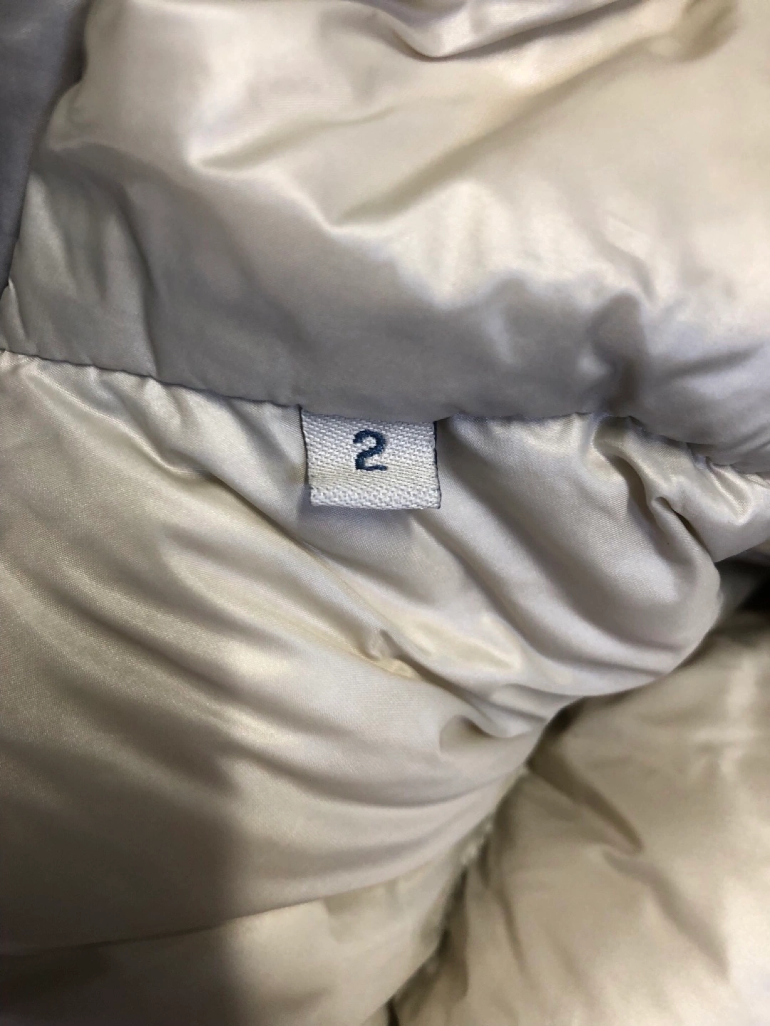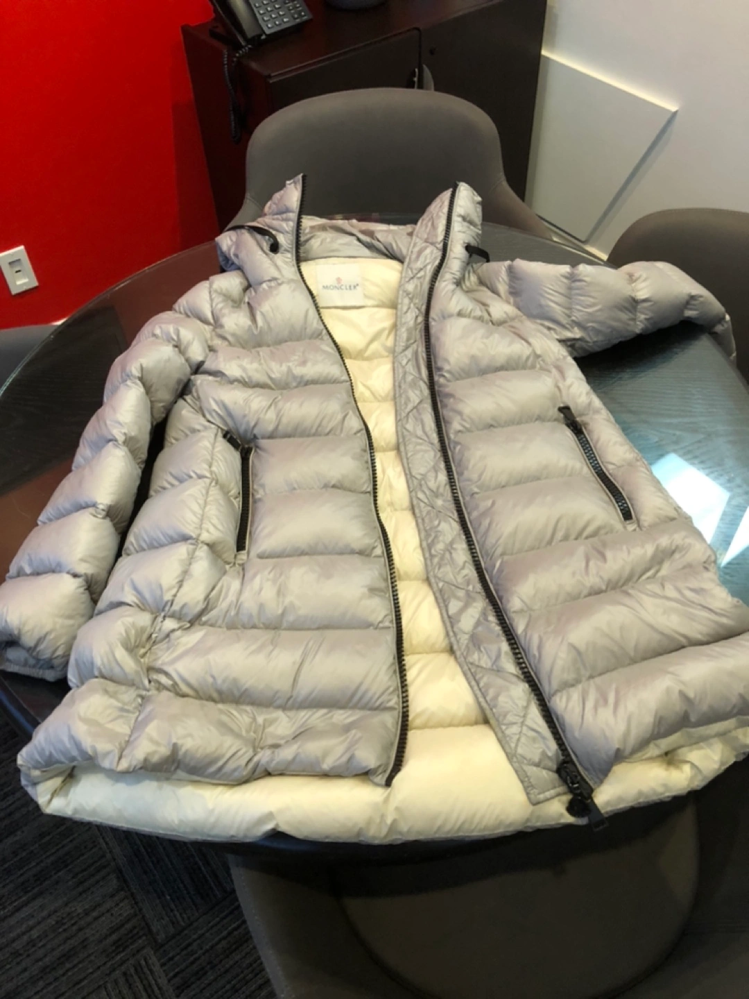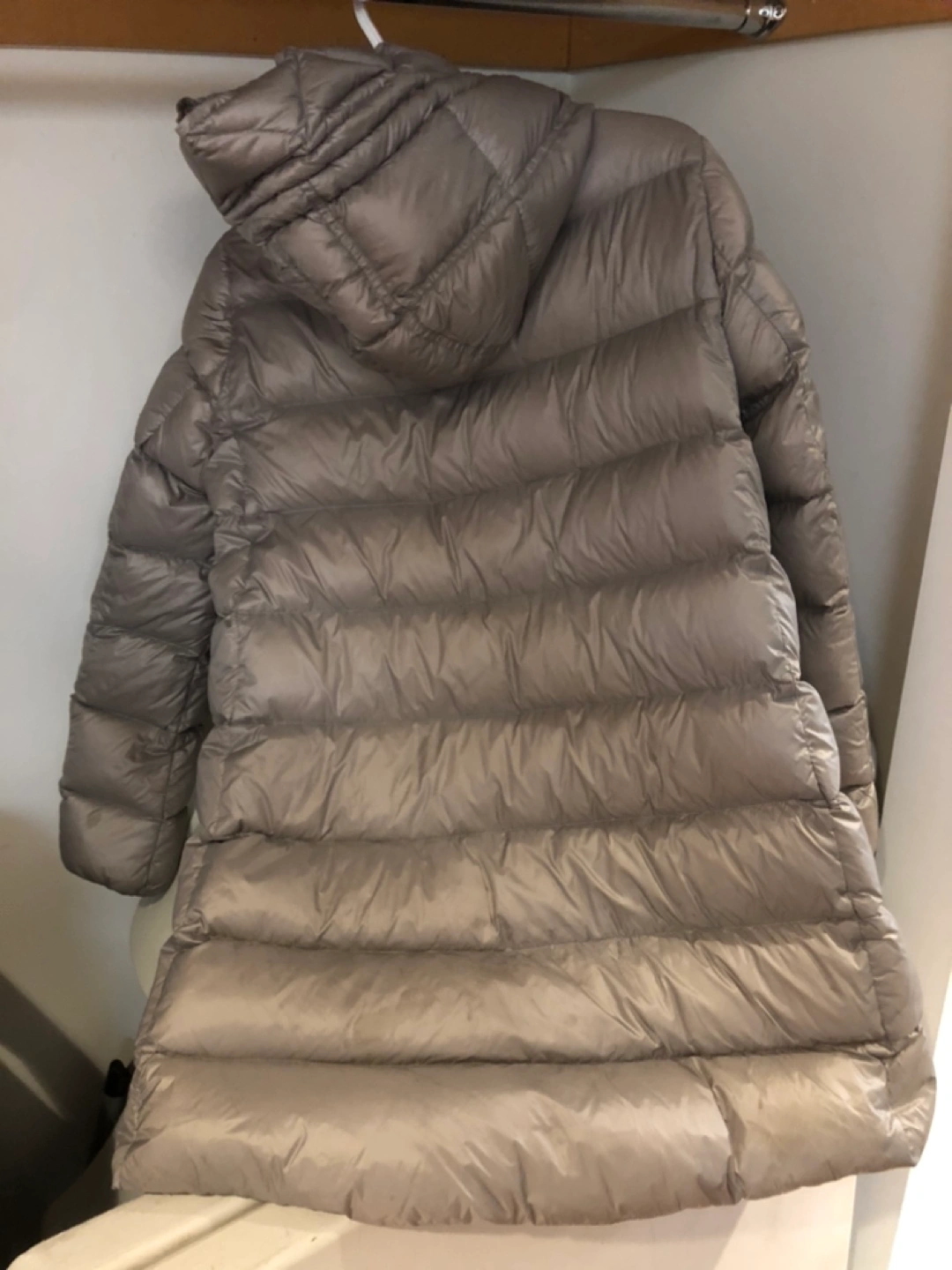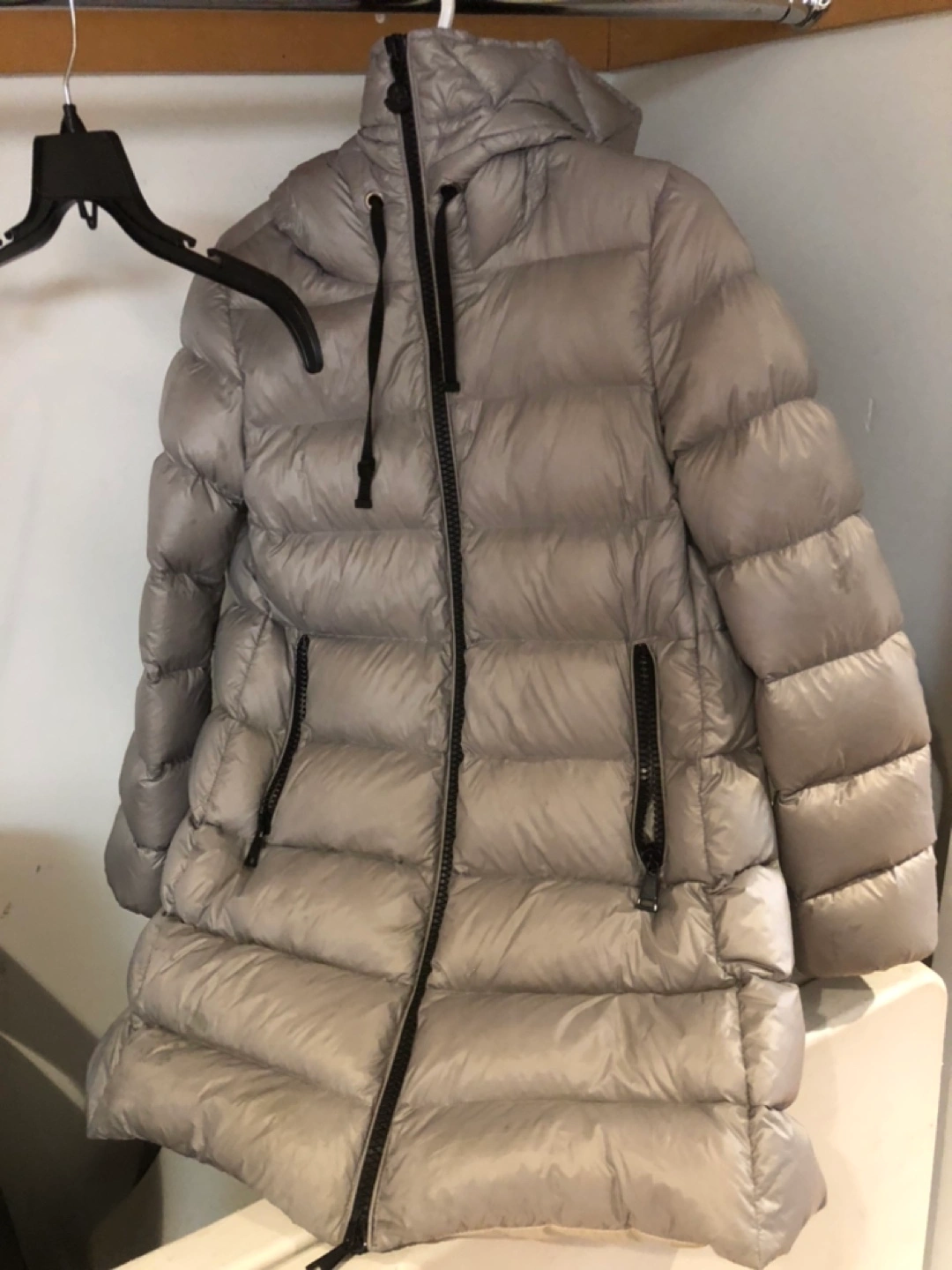 Grey down jacket with a hood, two side pockets, and zipper closure. Longue Saison label. Compare at $1,800 new. Located in the West End.