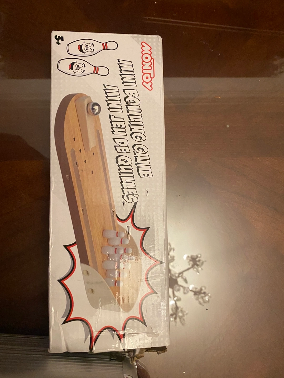Mini bowling game. Includes bowling pins and ball. All pieces included. In very good condition. Box is torn
