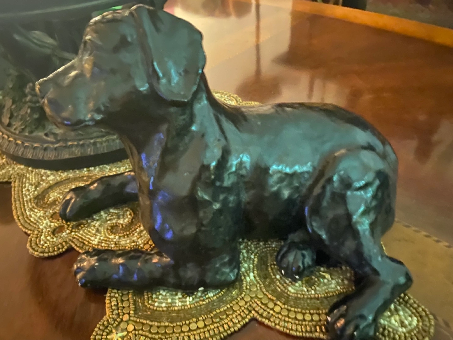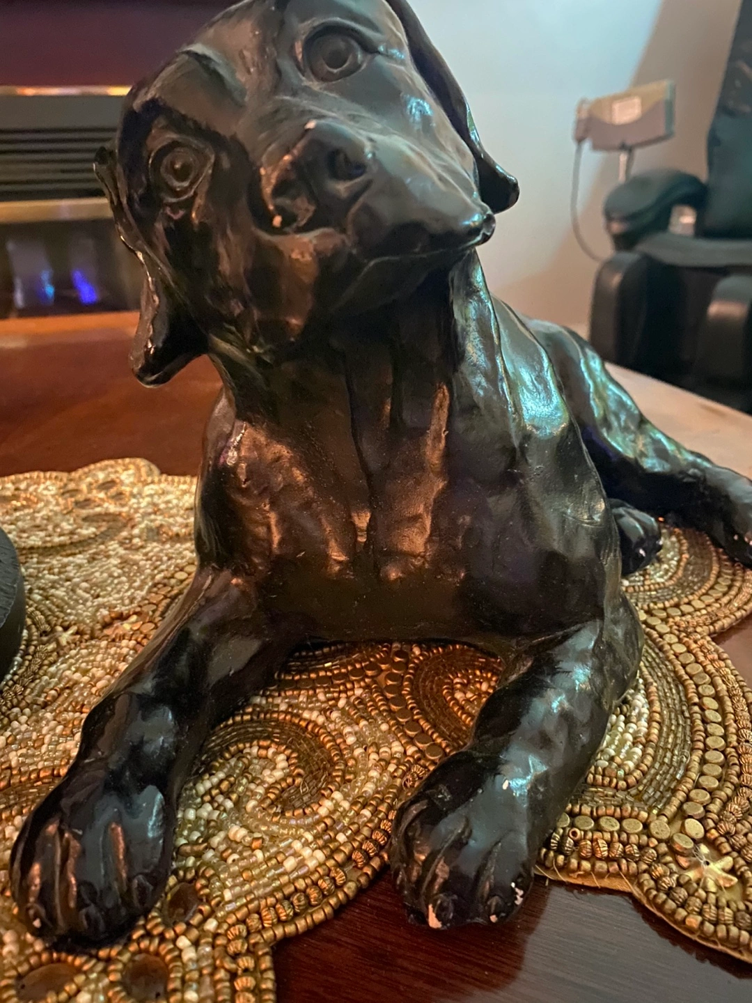Black Labrador Retriever dog statue in chocolate brown. Made of material that is very heavy. Measures approximately 14 inches long & 6” wide. Few paint chips.