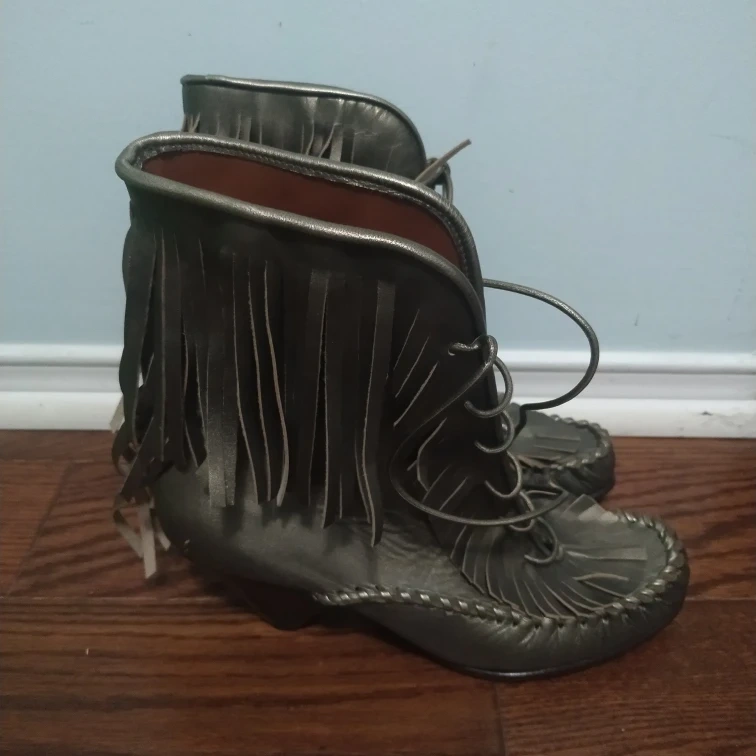 Grey leather boots with fringe detailing. Lace up closure. Low heel.