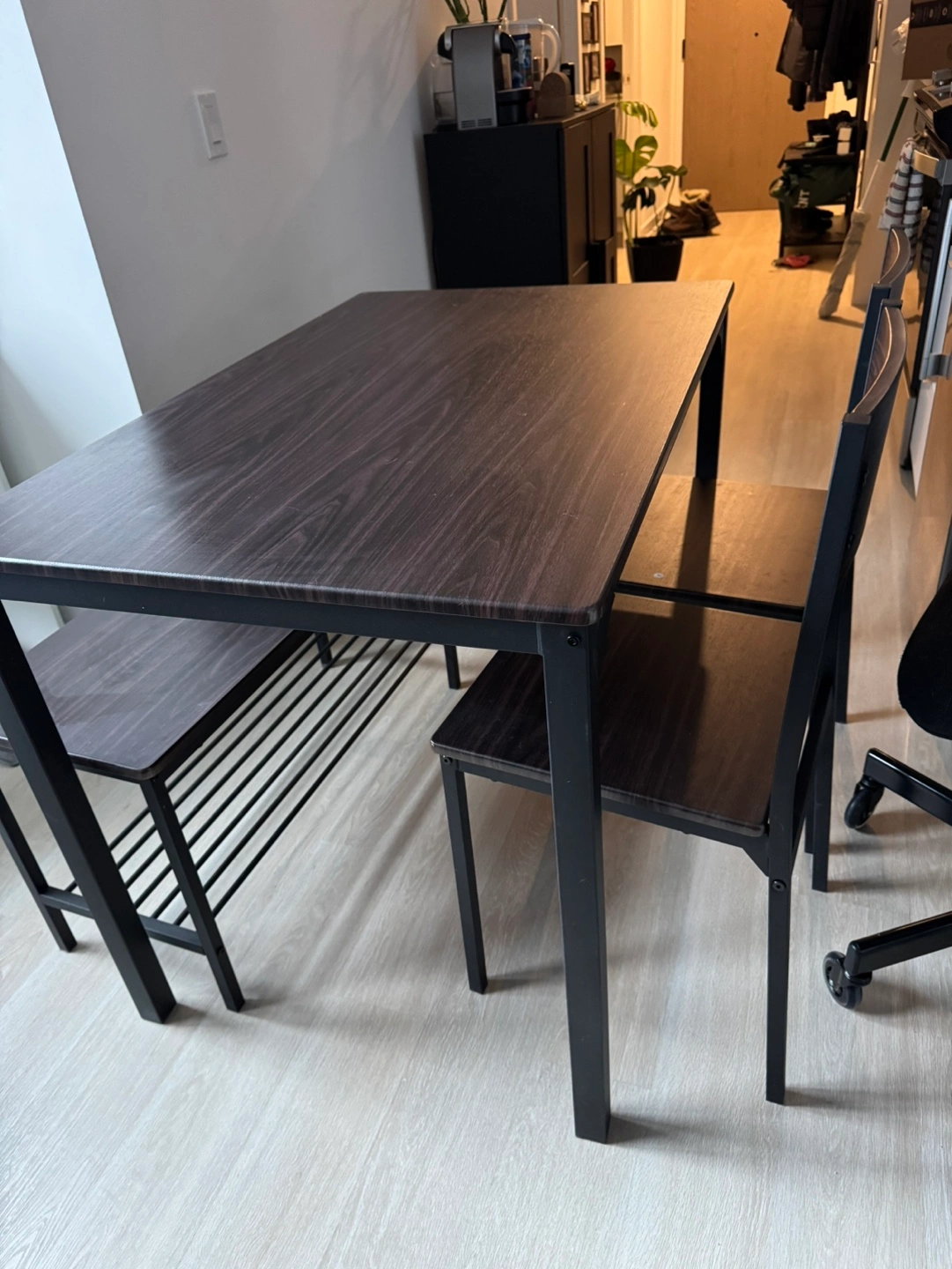 Dining table set with two chairs and a bench. Table top is dark wood laminate, with a black metal frame. Chairs are black metal with a dark wood seat. Sells for 218 on amazon before taxes