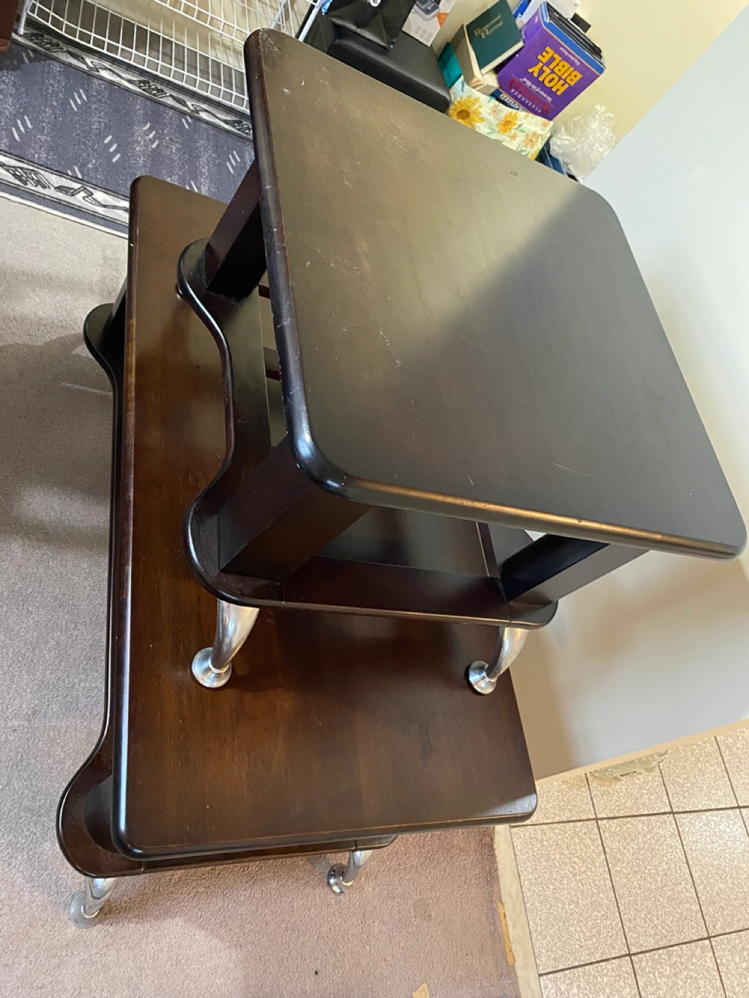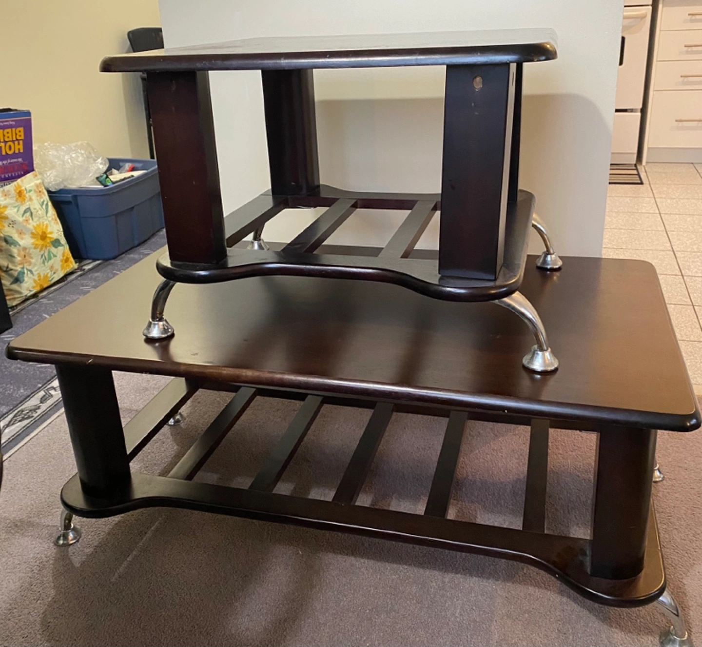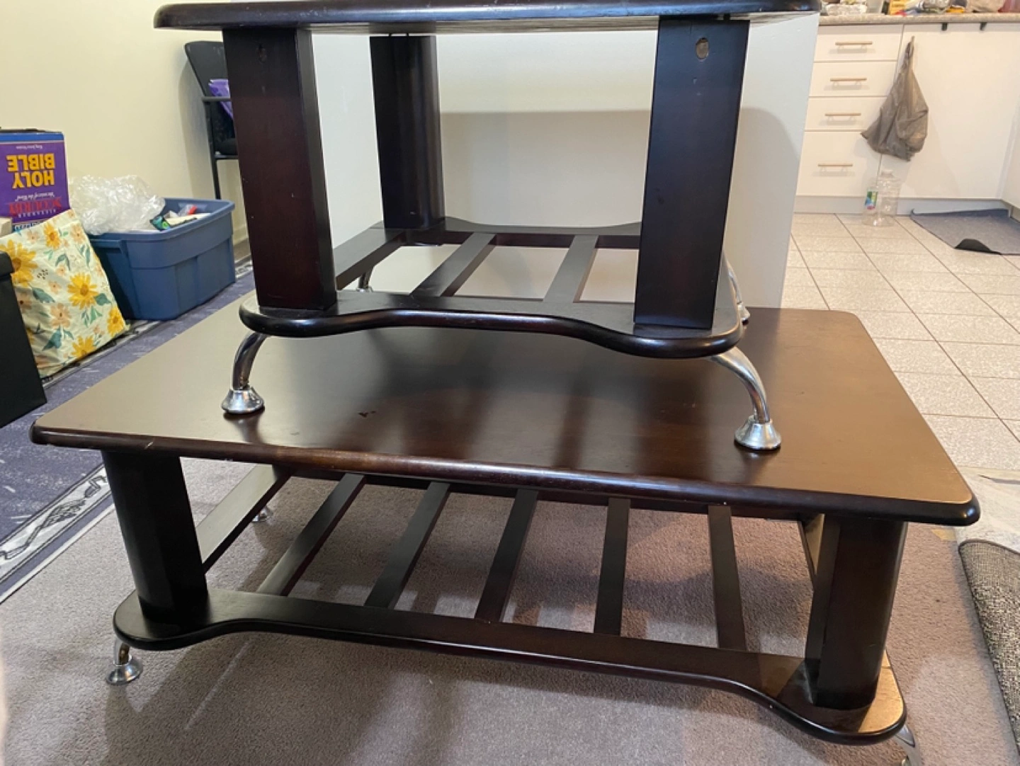 Two coffee tables with metal legs. Dark wood finish. A few scratches.
