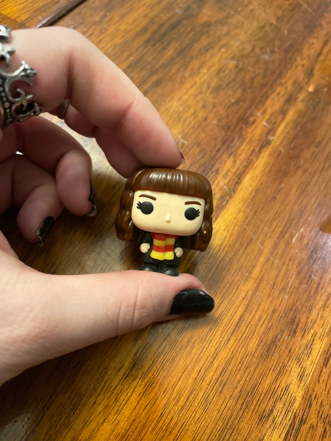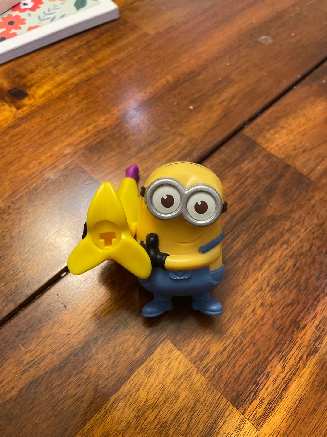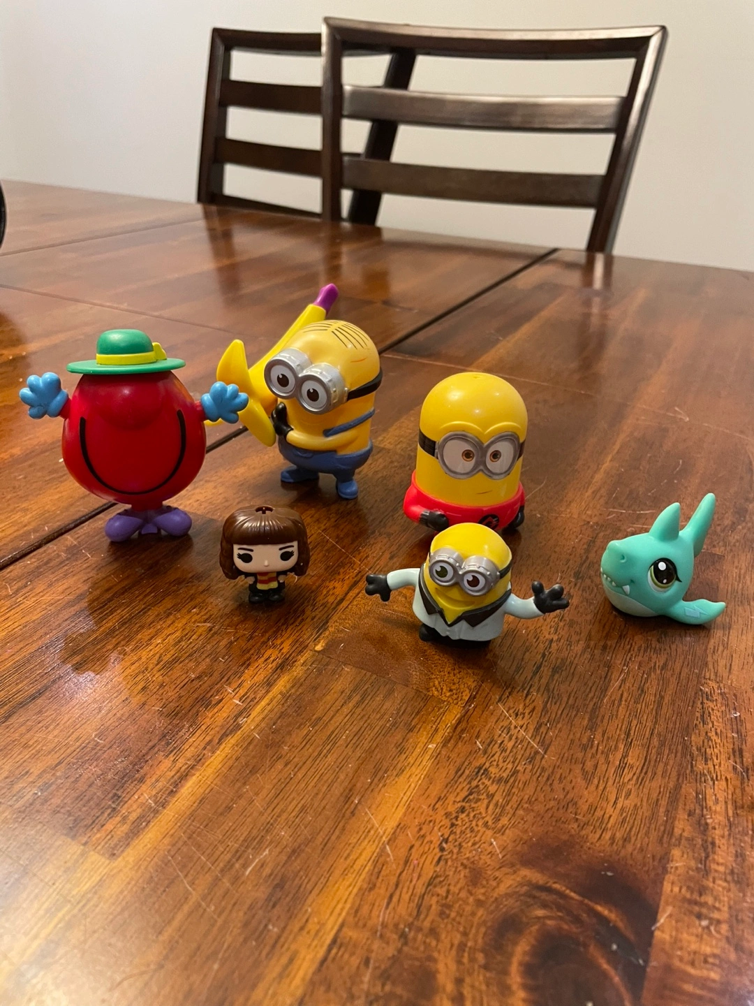 Set of 6 toys, including a Mr. Men character, a Littlest Pet Shop shark, 3 different minions, and a mini Hermione Granger funko pop.