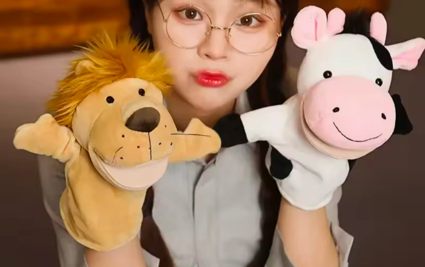 Two plush hand puppets, a lion and a cow. Both puppets are in good condition.New can get other animals