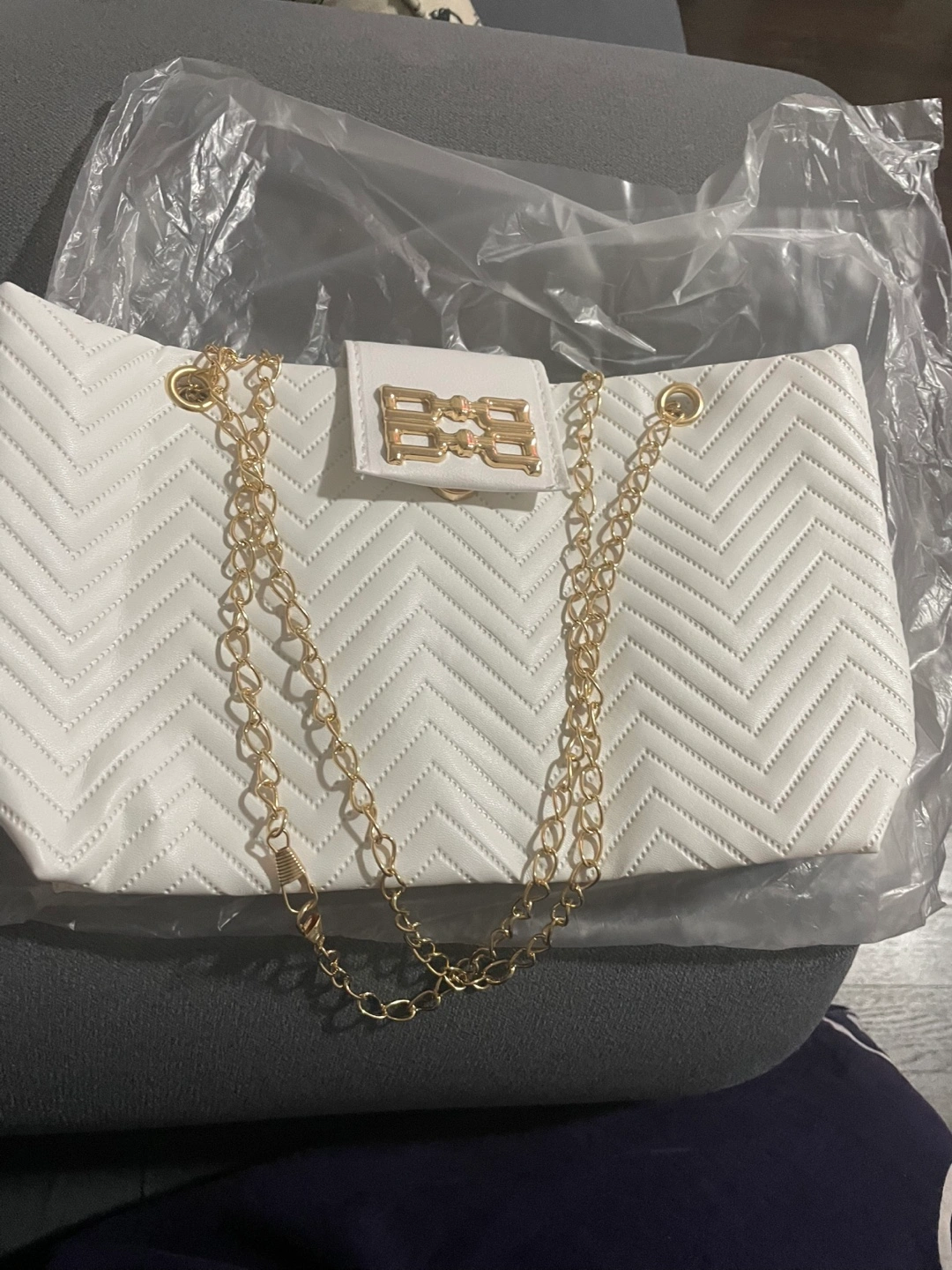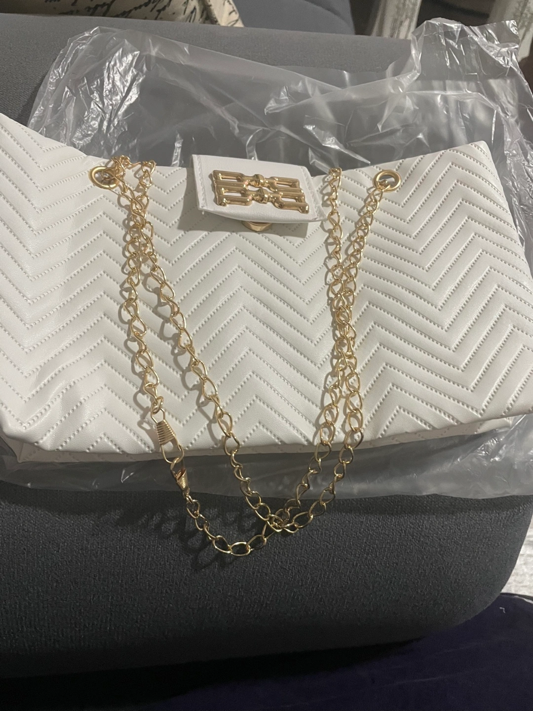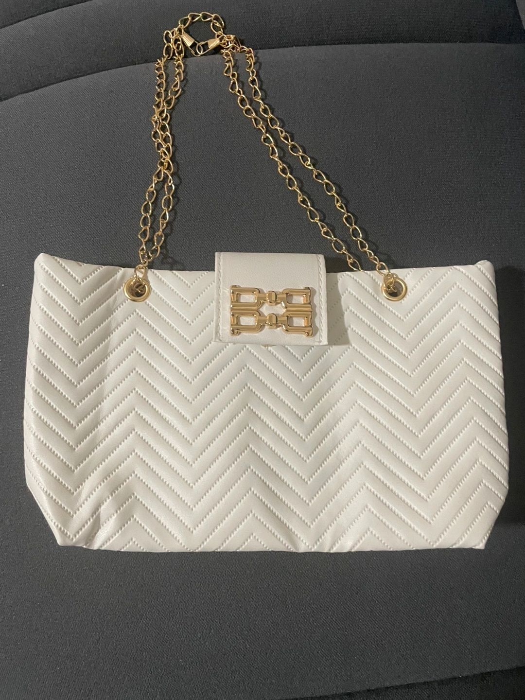 White quilted bag with gold chain strap and gold hardware. Features a flap closure with a magnetic snap.