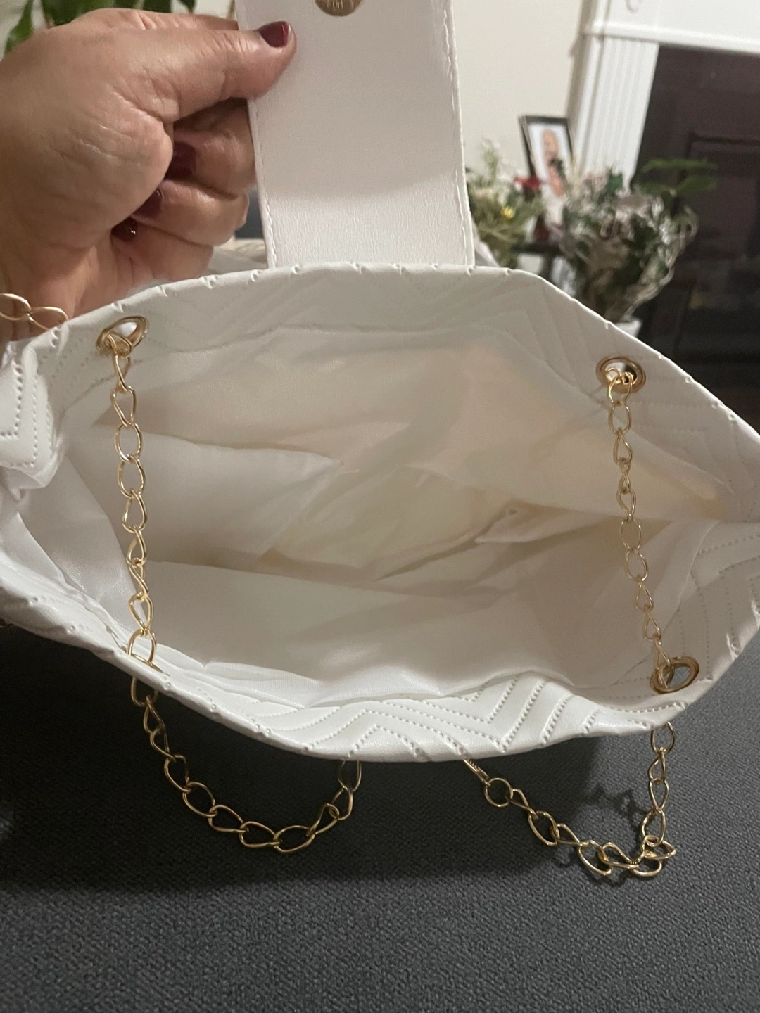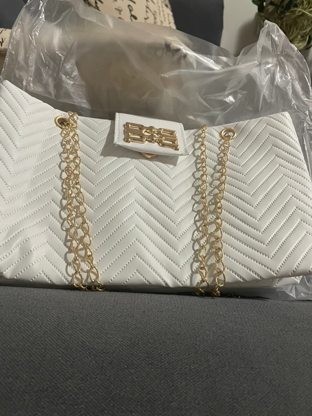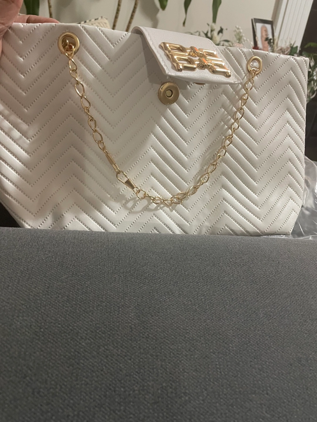 White quilted bag with gold chain strap and gold hardware. Features a flap closure with a magnetic snap.