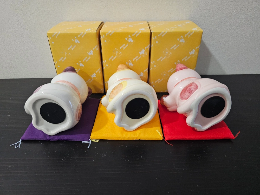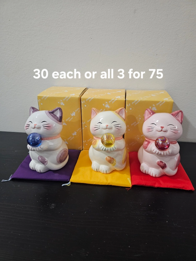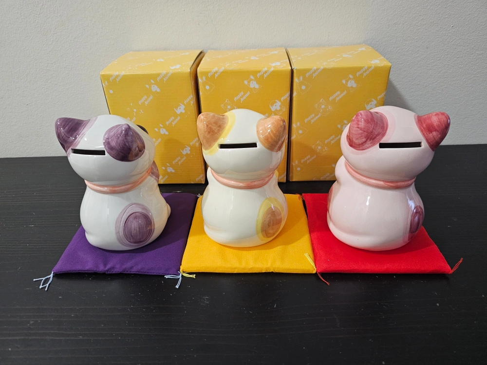 Three Maneki-Neko lucky cat piggy banks. Each cat has a different colour and comes with a small cushion and a box. Great gift or decor for your home.