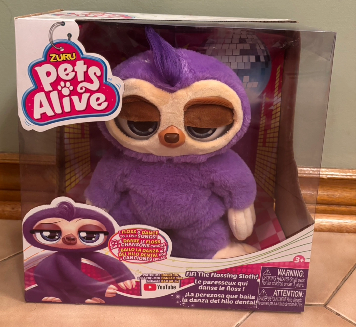 Purple sloth toy with electronic motion. Plays music and dances. Brand New. ***Pick up at 1795 St.Clair West.