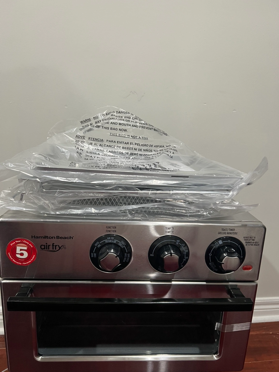 Stainless steel air fryer with multiple functions, including air fry, bake, roast, and reheat. Includes a removable crisper tray and baking pan. Comes with a glass door.
