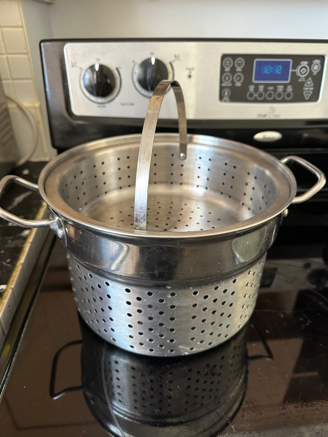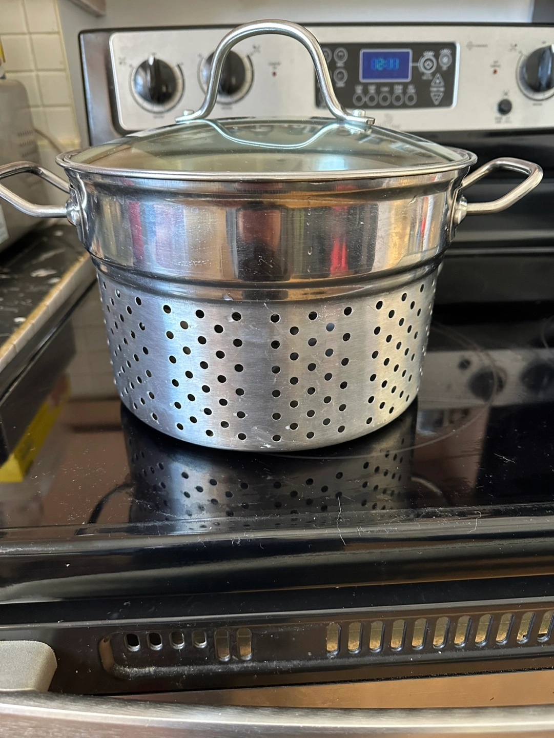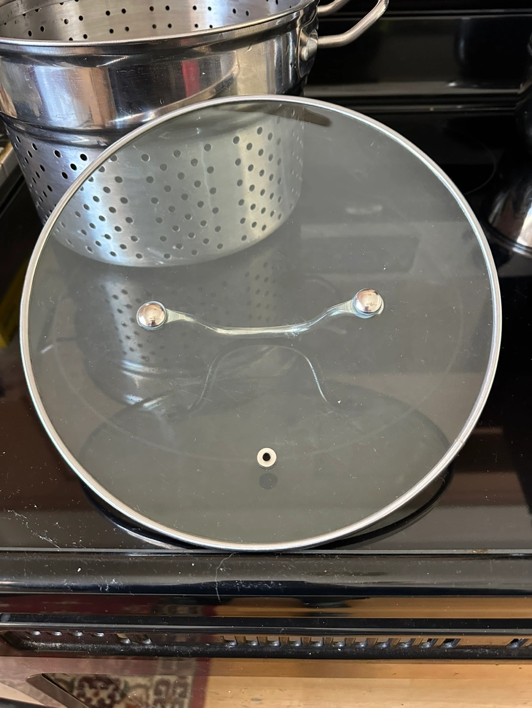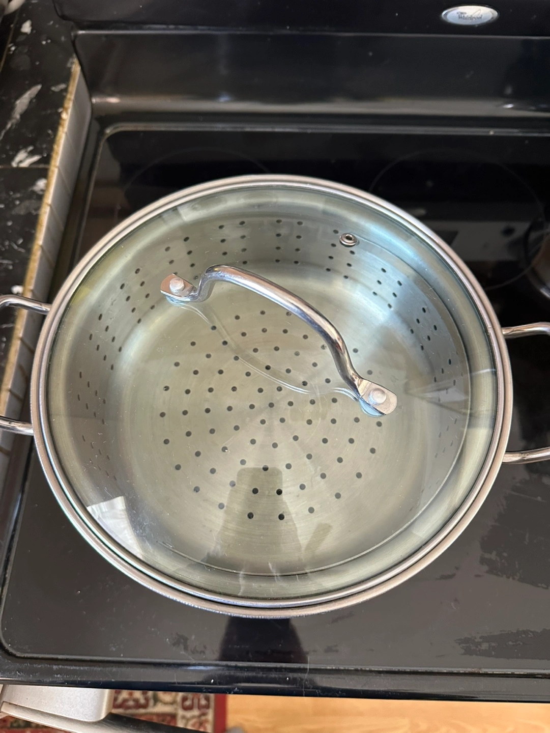 Stainless steel steamer with glass lid. Two piece set with a bottom and top portion, both with holes for steaming. Includes handle for lifting the top portion. No chips or cracks in the lid. Kitchen cupboard clean out. Smoke free home.
