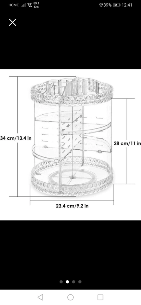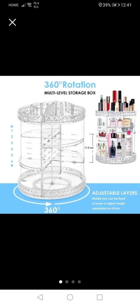 110Clear acrylic rotating makeup organizer with multiple levels and adjustable height. 360 degree rotation.