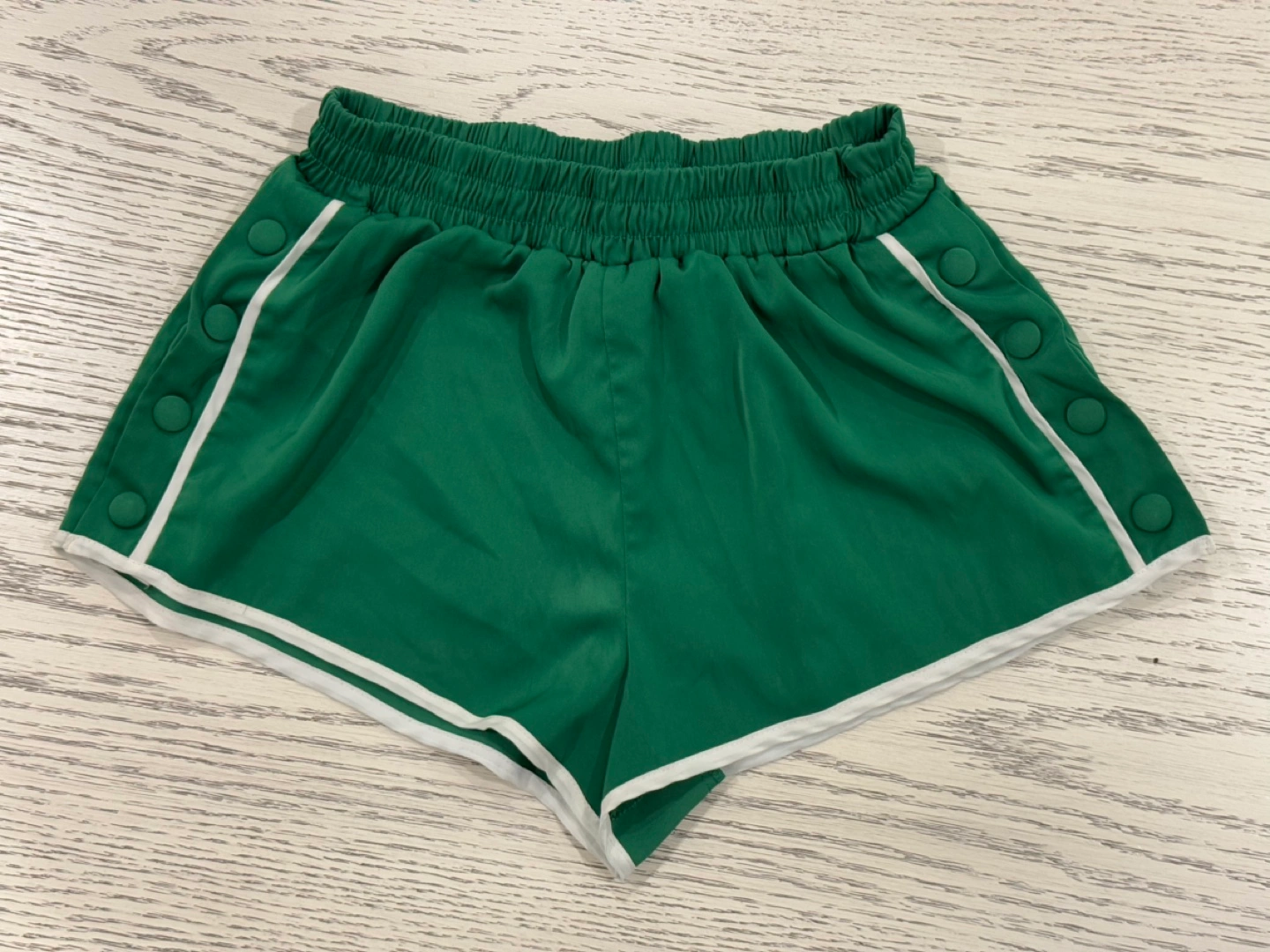 90s style basketball shorts with side snap buttons (You can unsnap them to your liking). Super flattering, smooth satin-like material with an elastic waist. Never really wore them, just been sitting in my closet. Great for the gym!