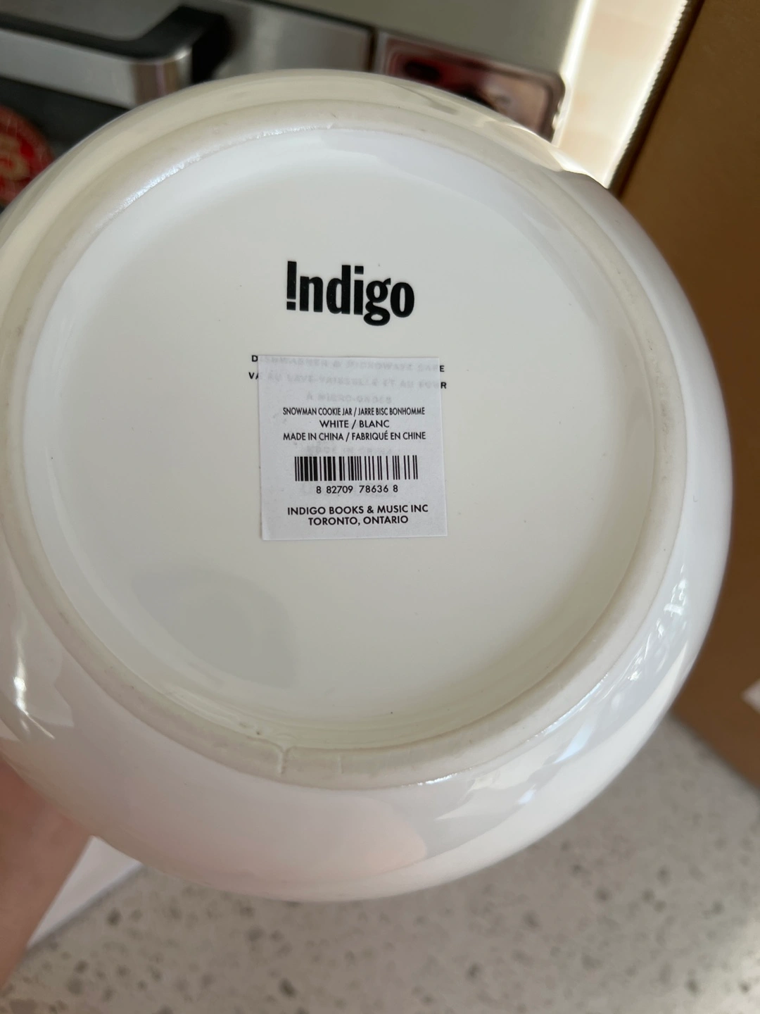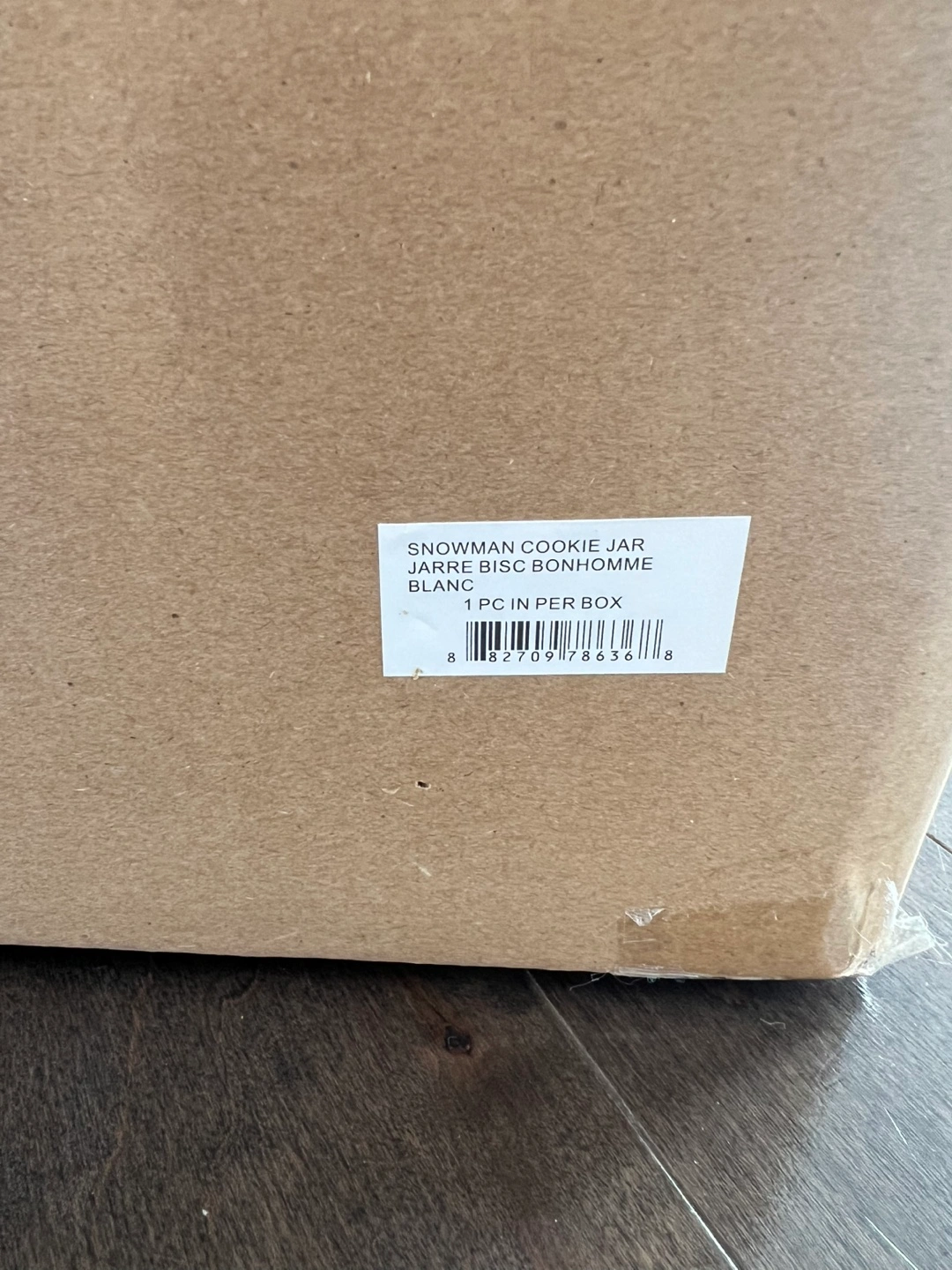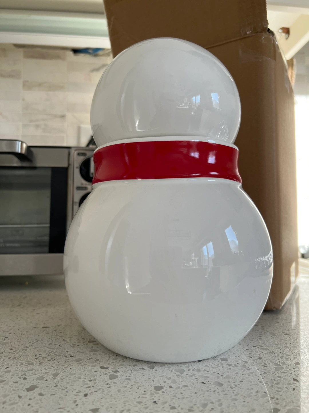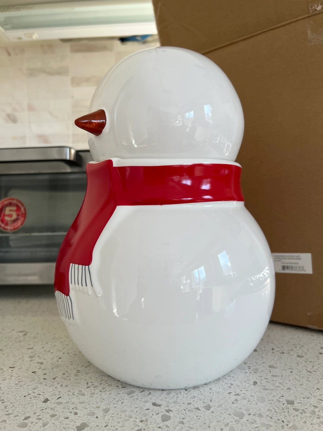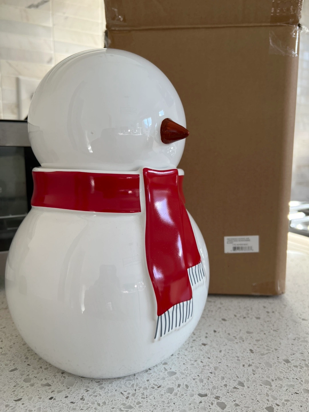 107White snowman cookie jar with a red scarf. The jar has a removable lid and is in new condition - just taken out of box.
