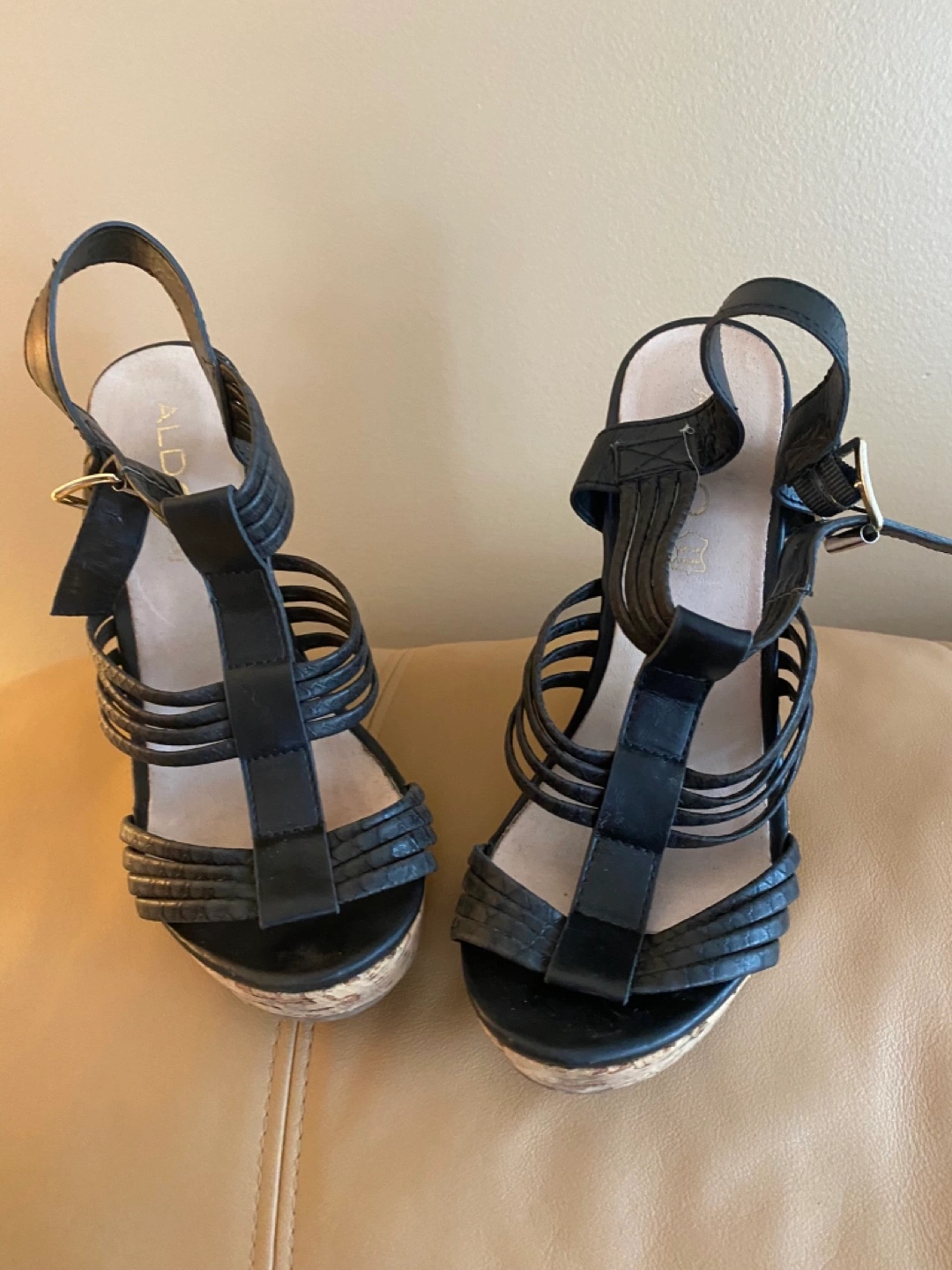 Black wedge sandals with cork wedge. Adjustable ankle strap with buckle, size 8 in excellent condition