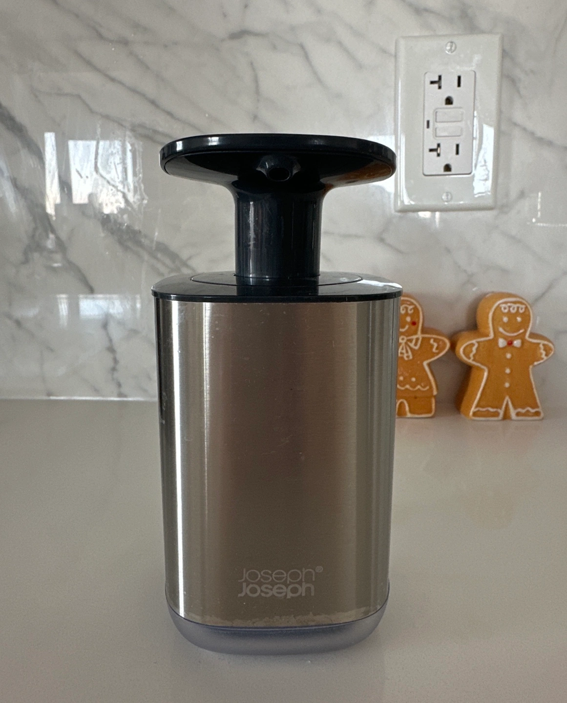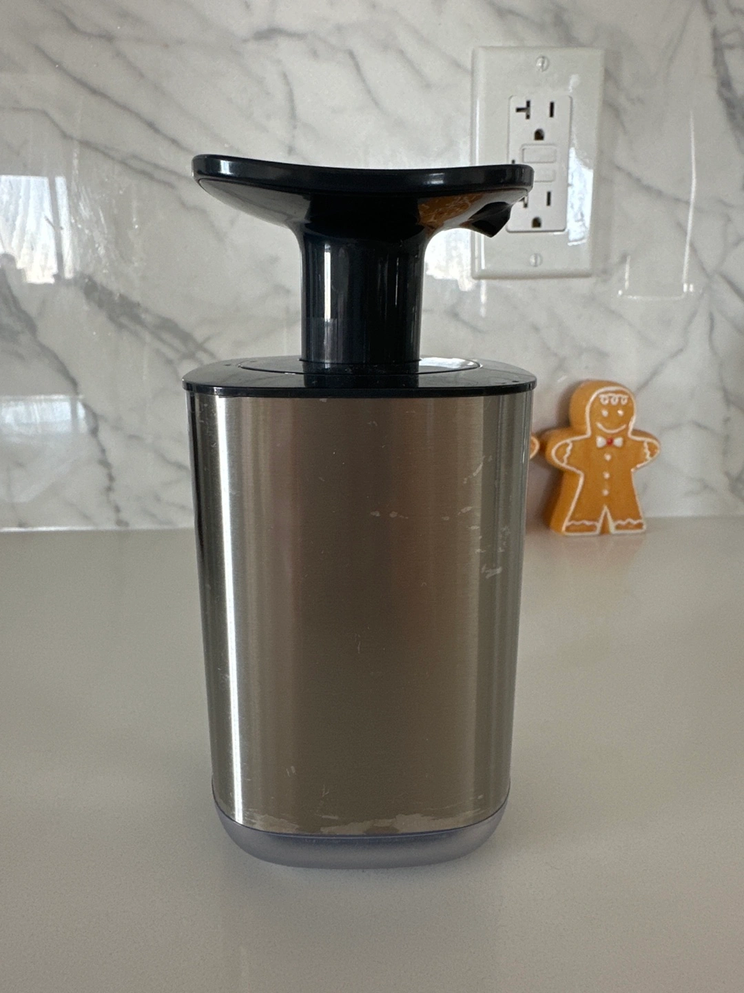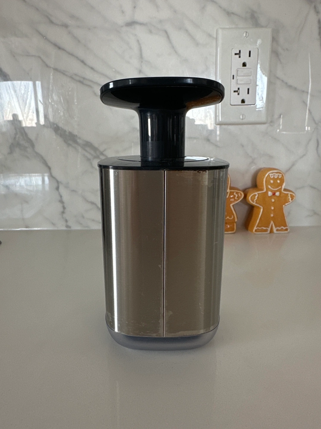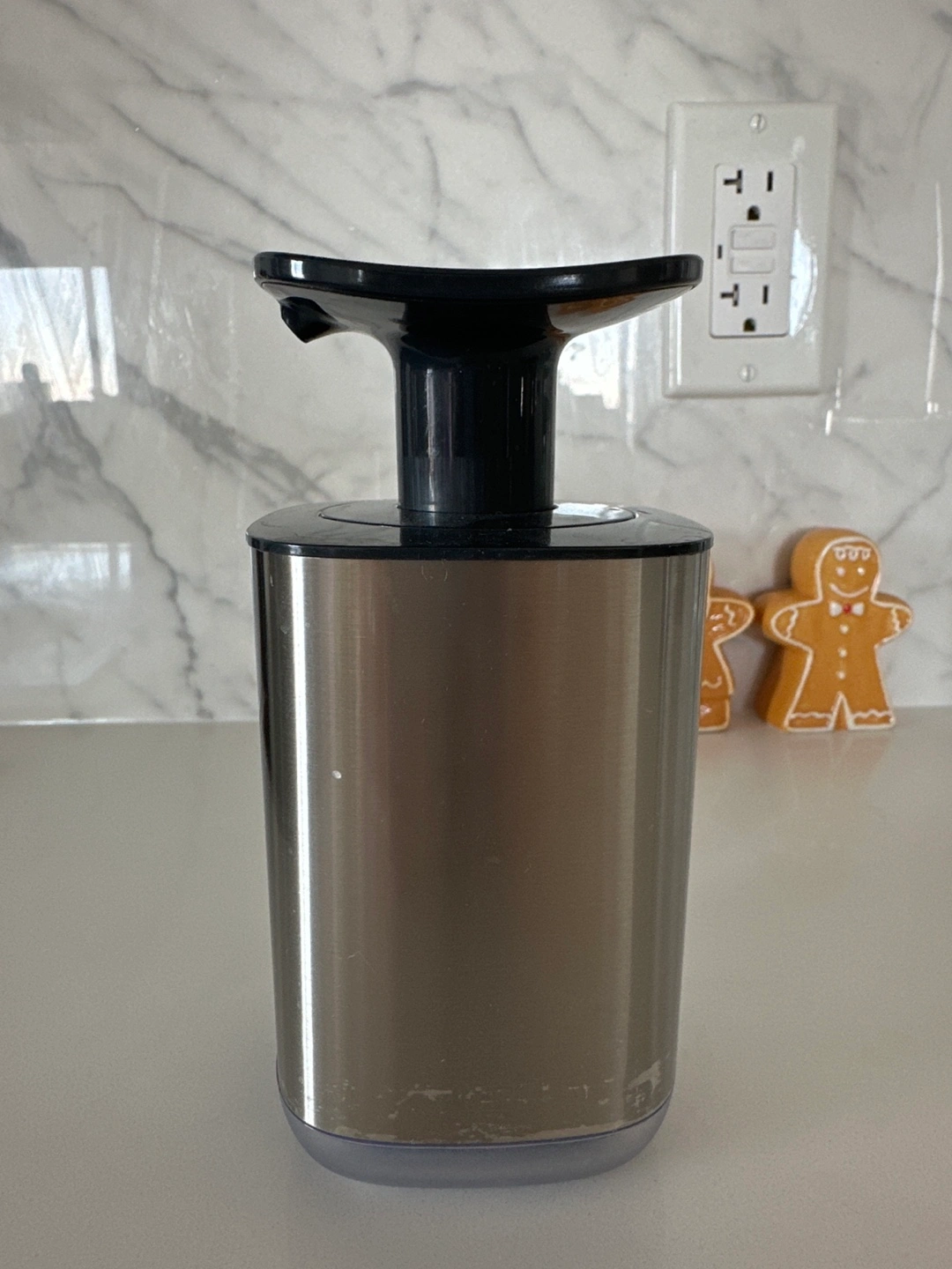 Stainless steel soap dispenser with a black pump. In good conditions, but has some water marks.