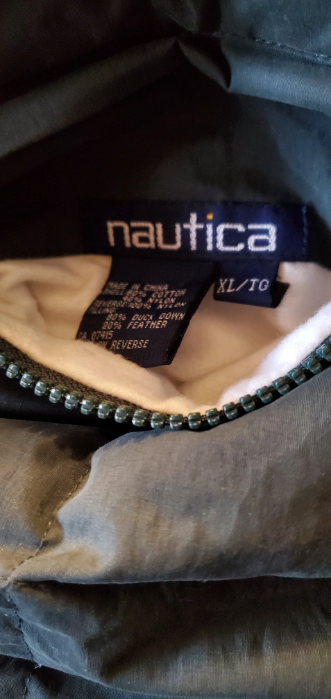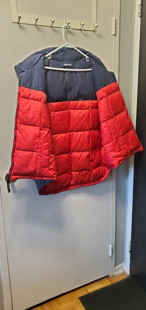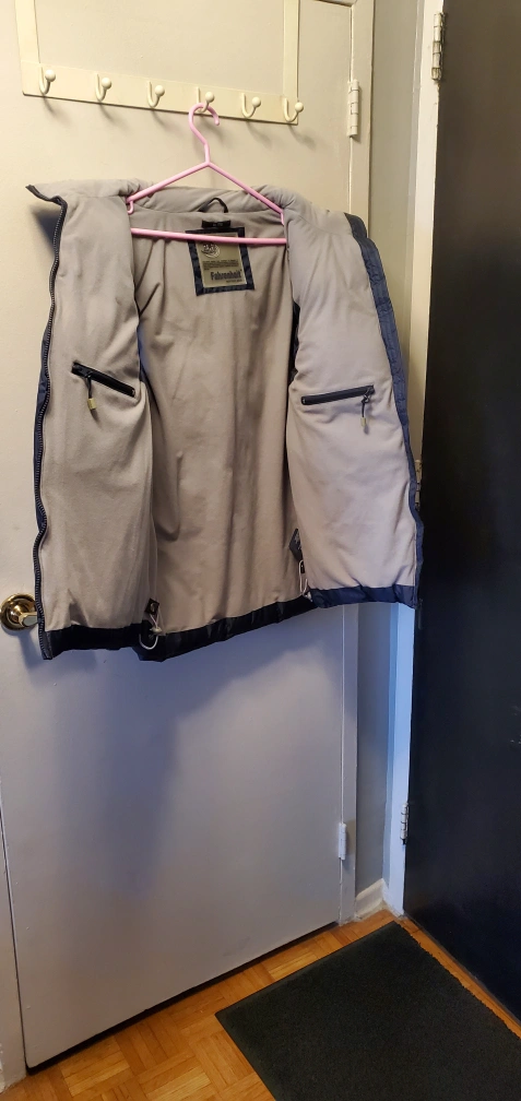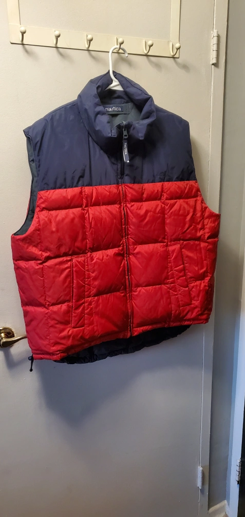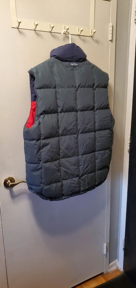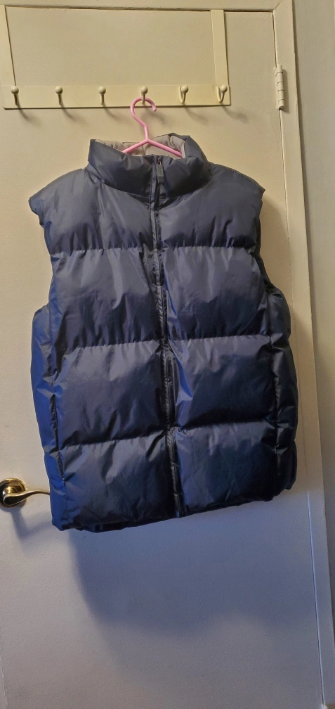 Men's puffer vest, navy blue, size XL/TG. Has zippered pockets on the front and inside.