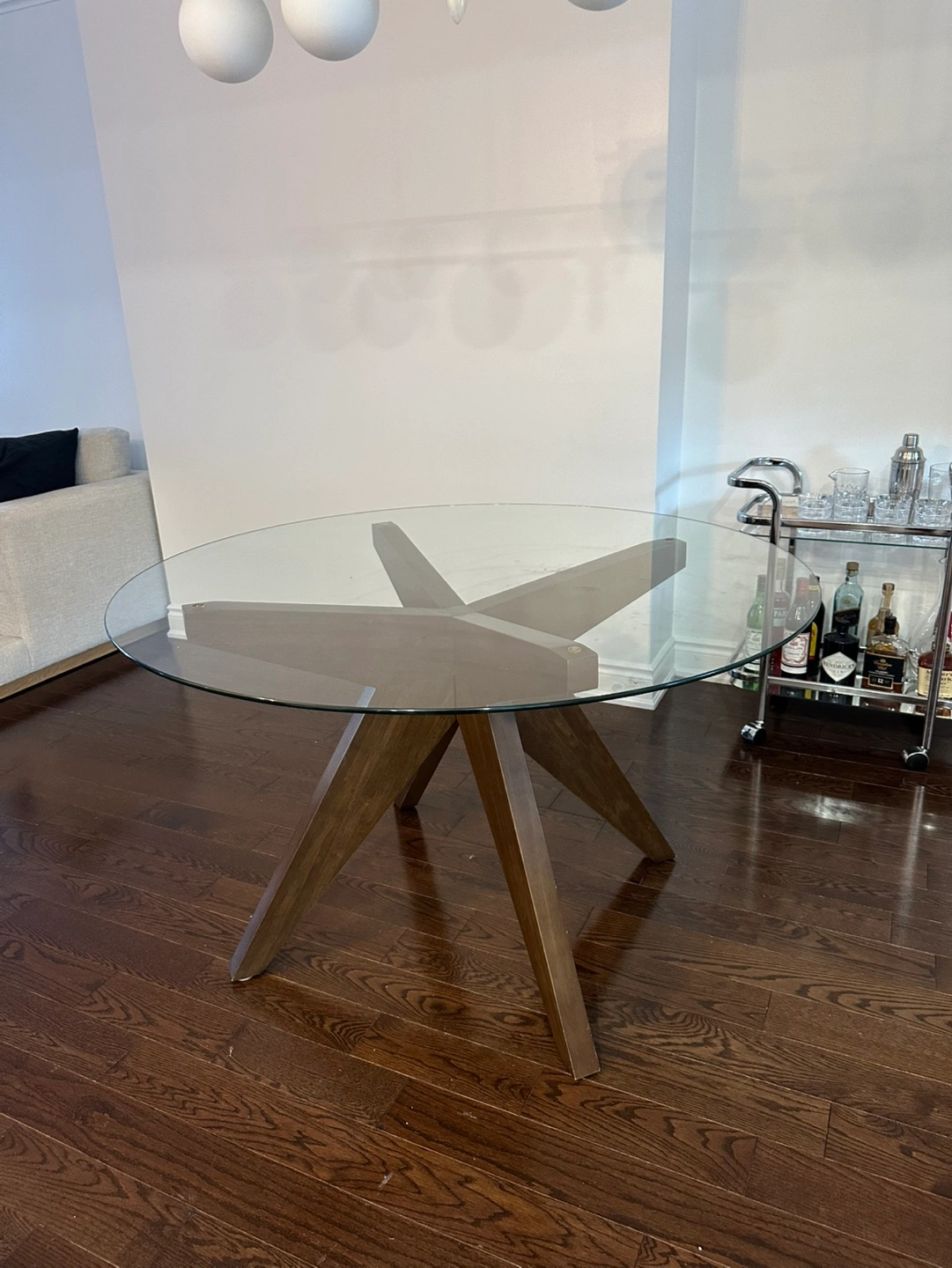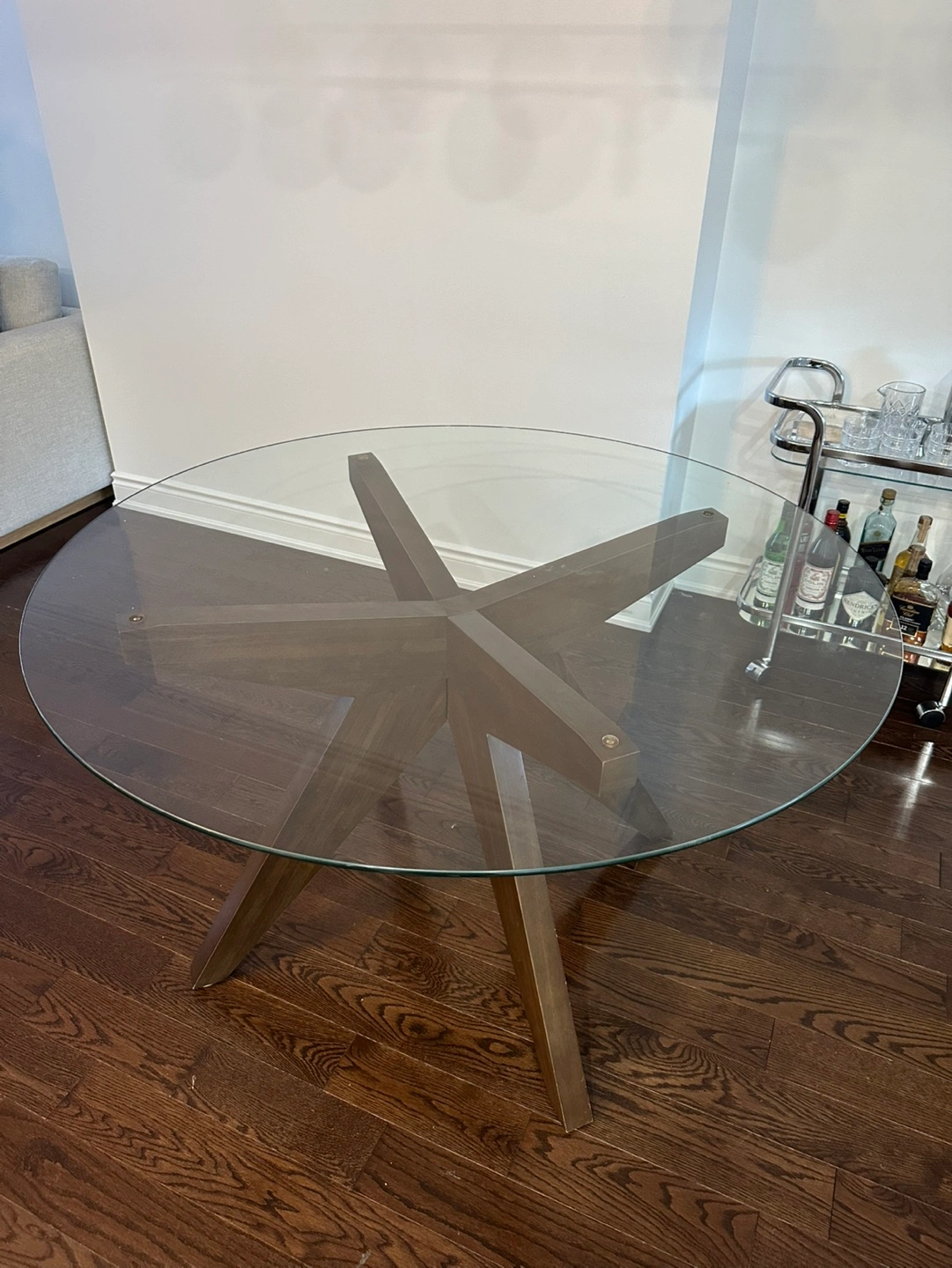 Round glass tabletop with a wooden base. Four legs are connected in a star shape. The table is in great condition & seats 4-5 people comfortably. Pickup only.