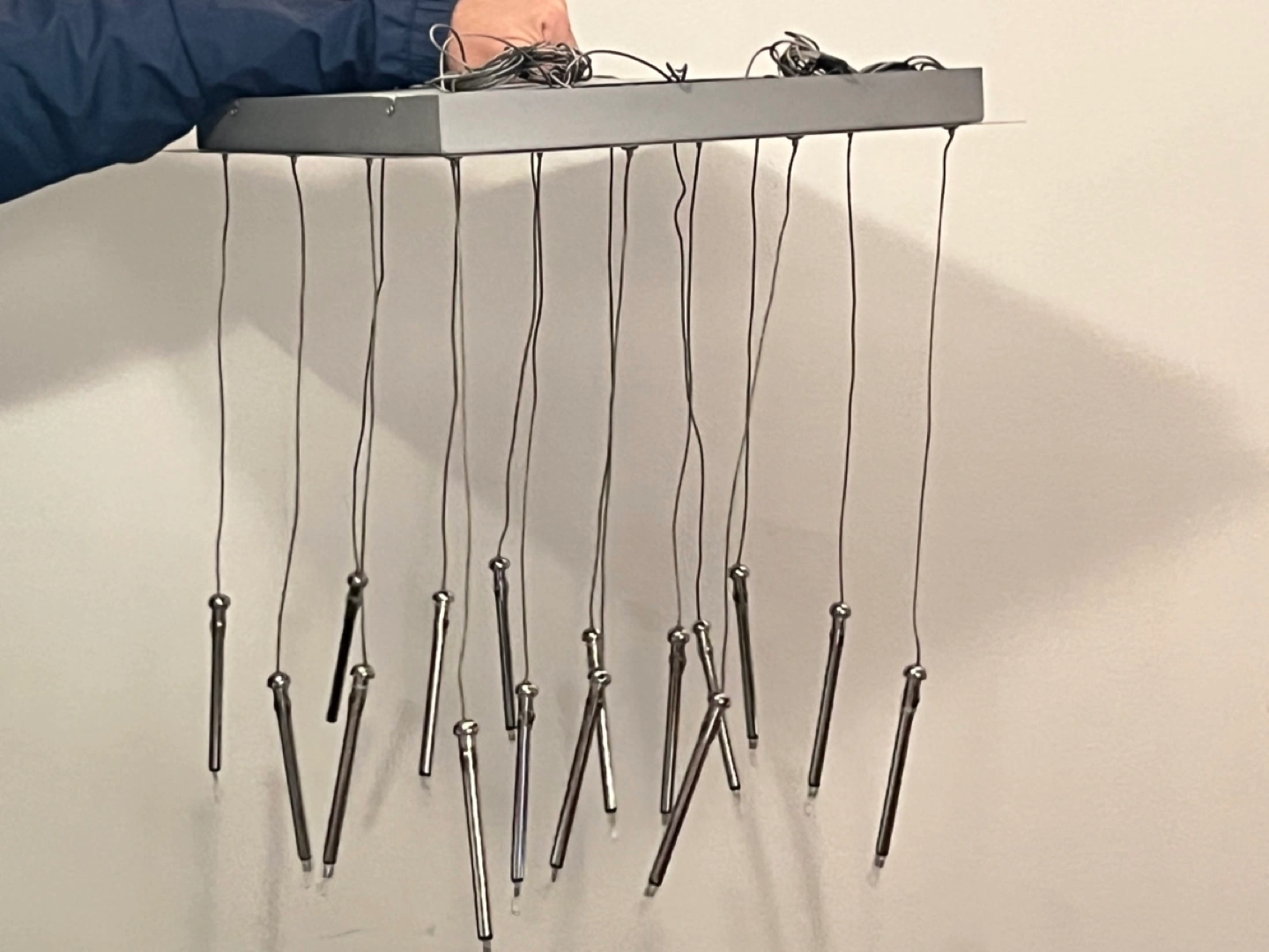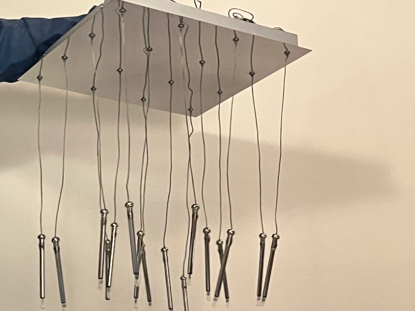 147Chandelier with multiple light bulbs hanging from a square metal frame. Comes with all light bulbs. Light bulbs are not LED. Has been professionally cleaned. Lights hang 18 inches down