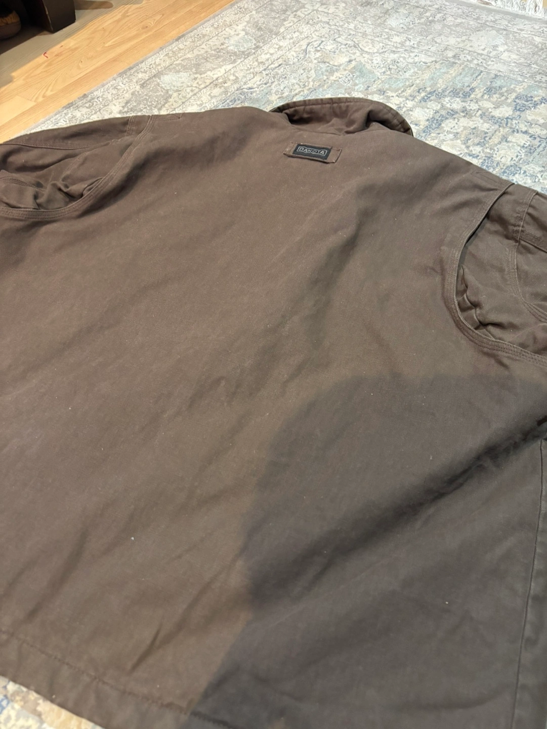 Brown jacket with a black corduroy collar. Zipper closure. Two chest pockets. Two lower pockets. One inside pocket. In great condition great for all those vintage lovers