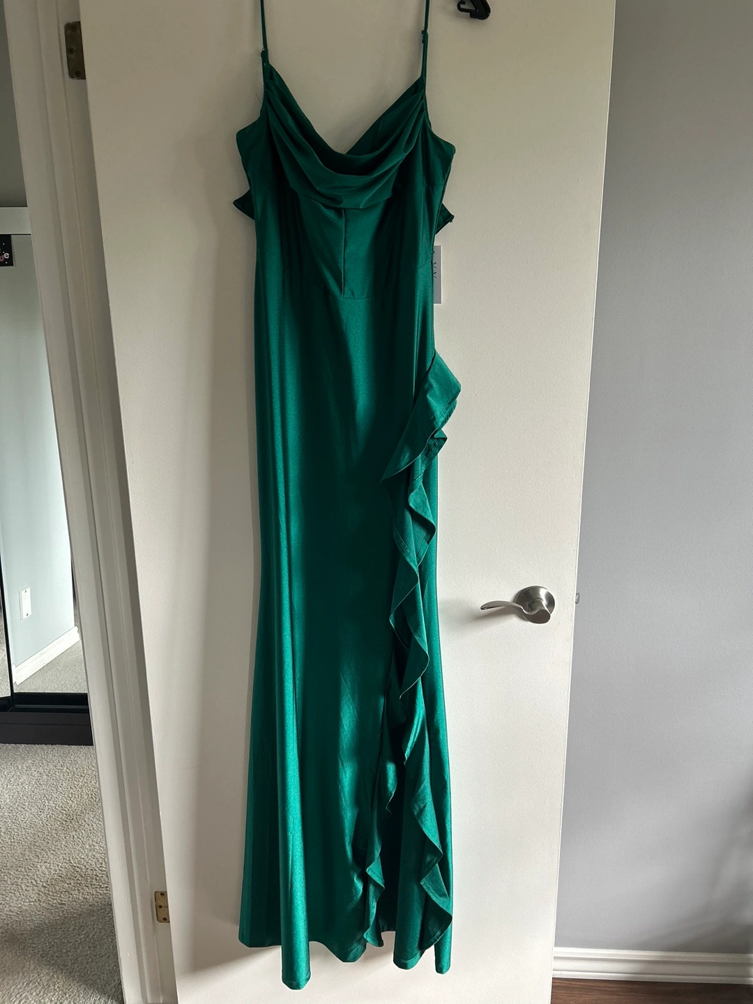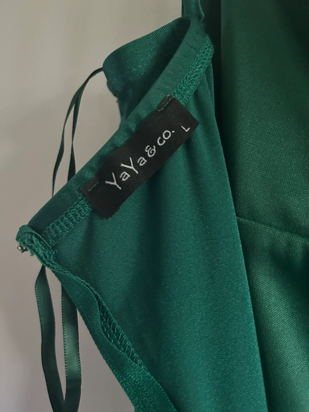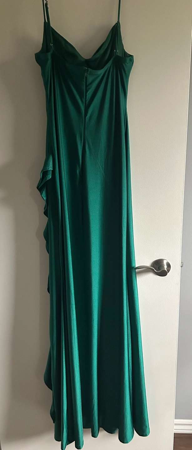 Green maxi dress with a ruched bodice and a fitted skirt. The dress is sleeveless and has a low-cut neckline. Only ever been worn once,