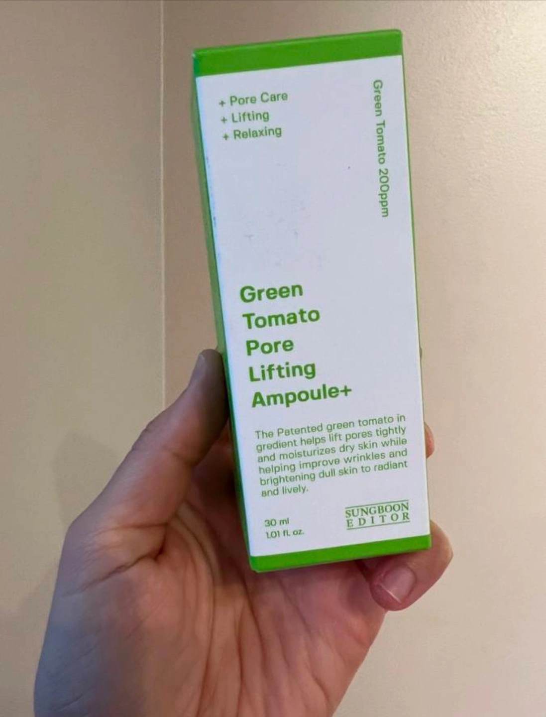Green Tomato Pore Lifting Ampoule+ with 200ppm Green Tomato. Helps lift pores tightly, moisturizes dry skin, improves wrinkles, and brightens dull skin.