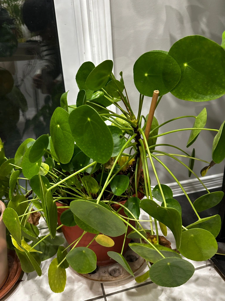Large houseplant with round leaves. Plant is in a terracotta pot.