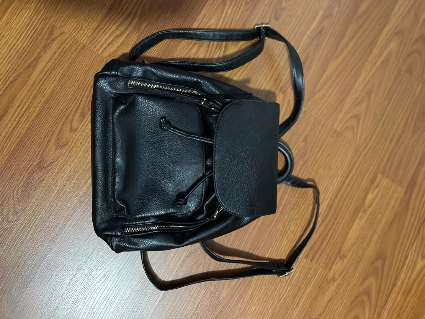 Black backpack with gold hardware, drawstring closure with top flap, and multiple pockets. Adjustable straps. Used once. I prefer a bigger one. Bought for 59+tax