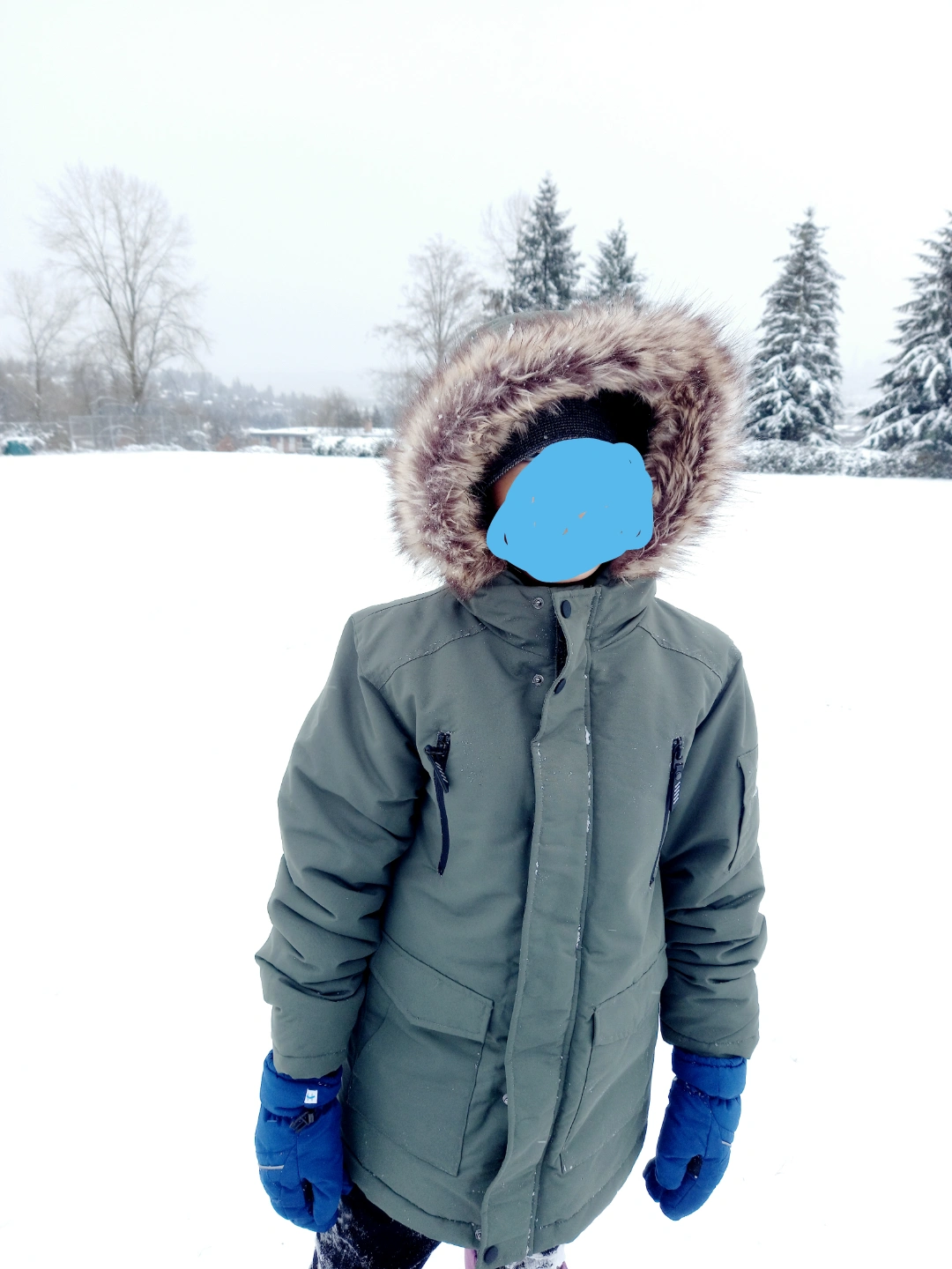 Green winter jacket with faux fur lined hood. Has zipper and button closure. Has two pockets and two zippered pockets.