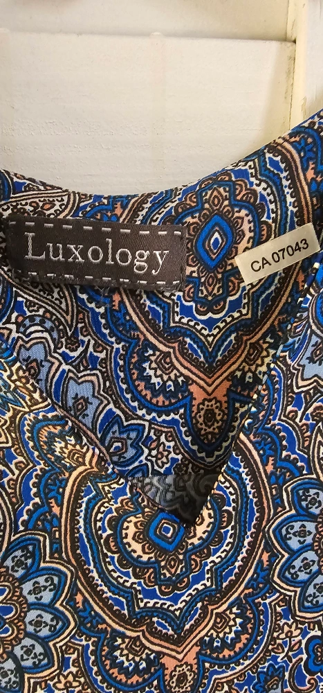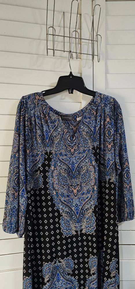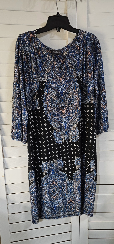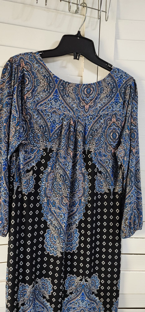 Blue and black patterned dress with 3/4 sleeves. V-neckline.