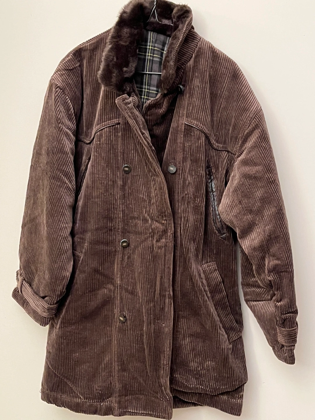 New brown corduroy jacket with a fur collar. Double breasted with button closure. Two pockets on the front and one on the inside. Has a plaid lining. Never worn. Size: Medium. Length 35” and sleeve length from shoulder 21”.