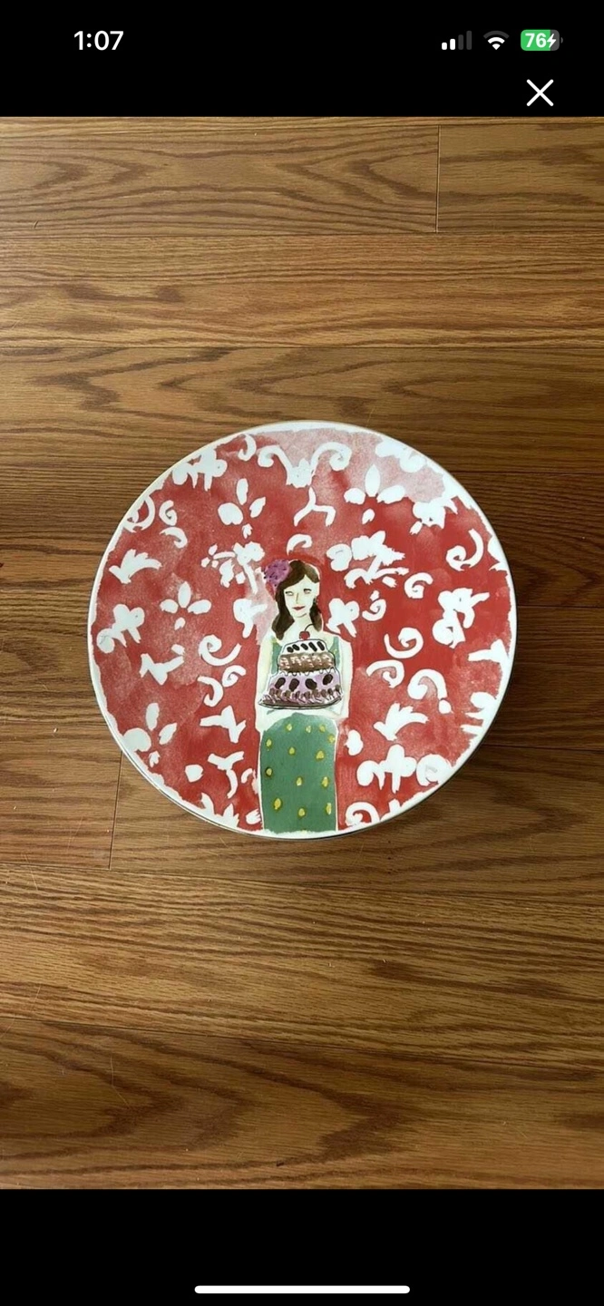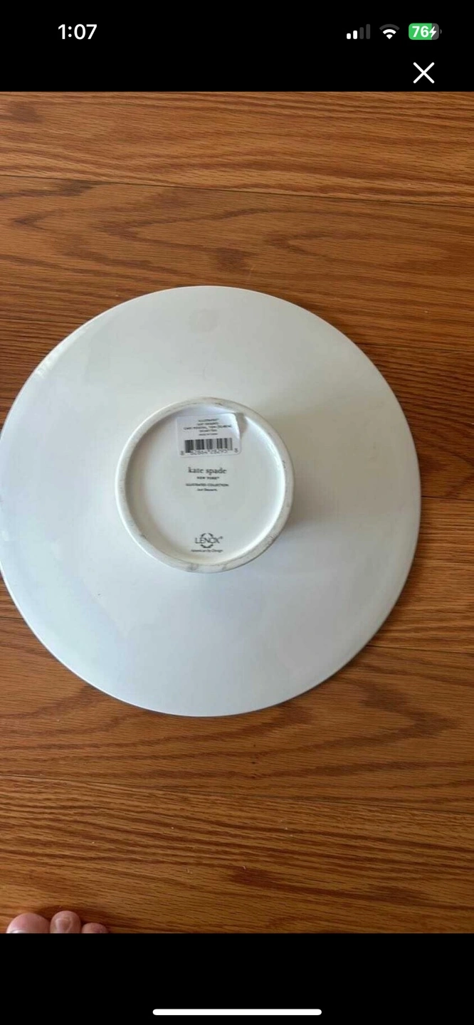 37White cake pedestal with red and green illustration. 12 inches in diameter.