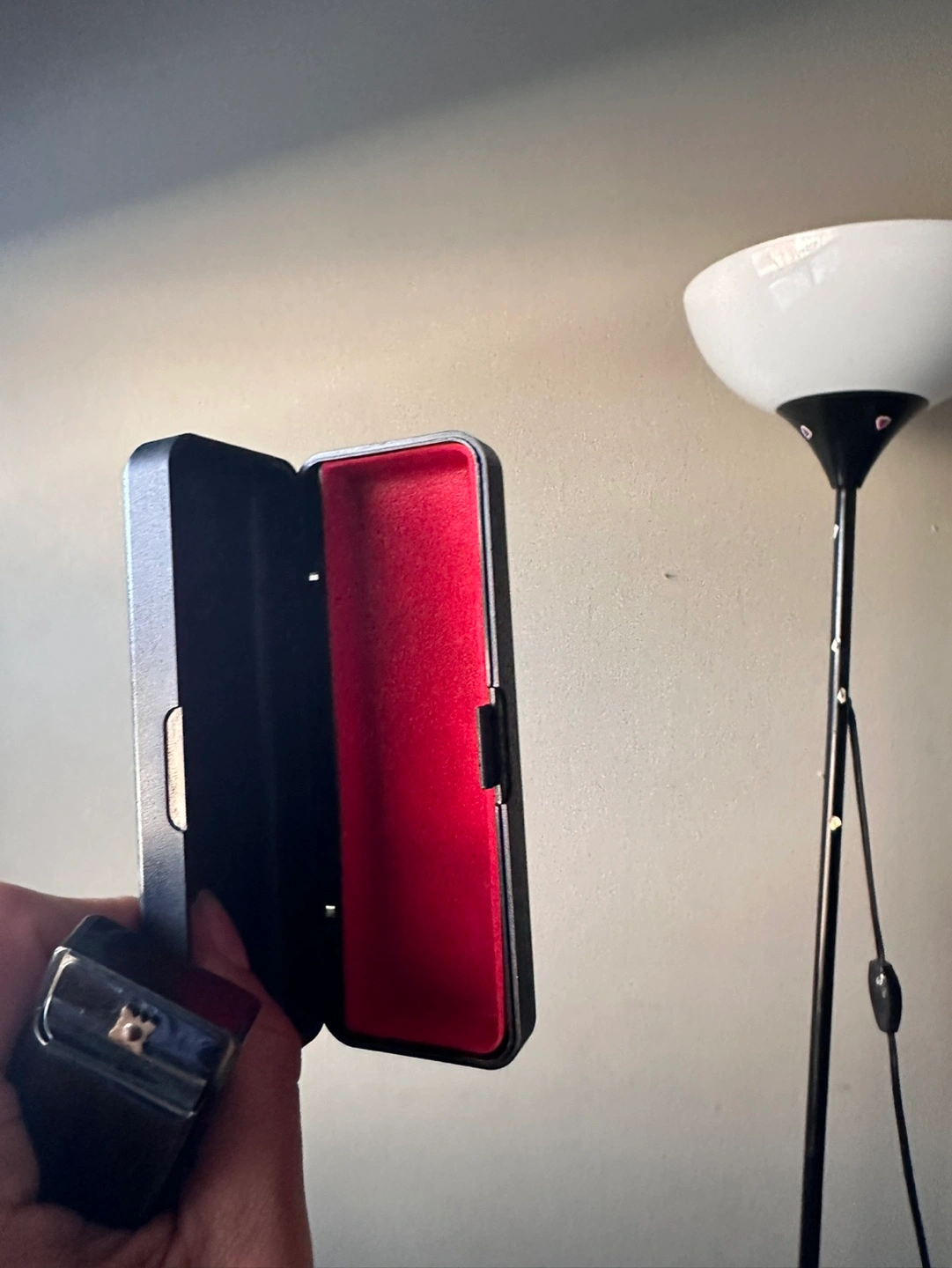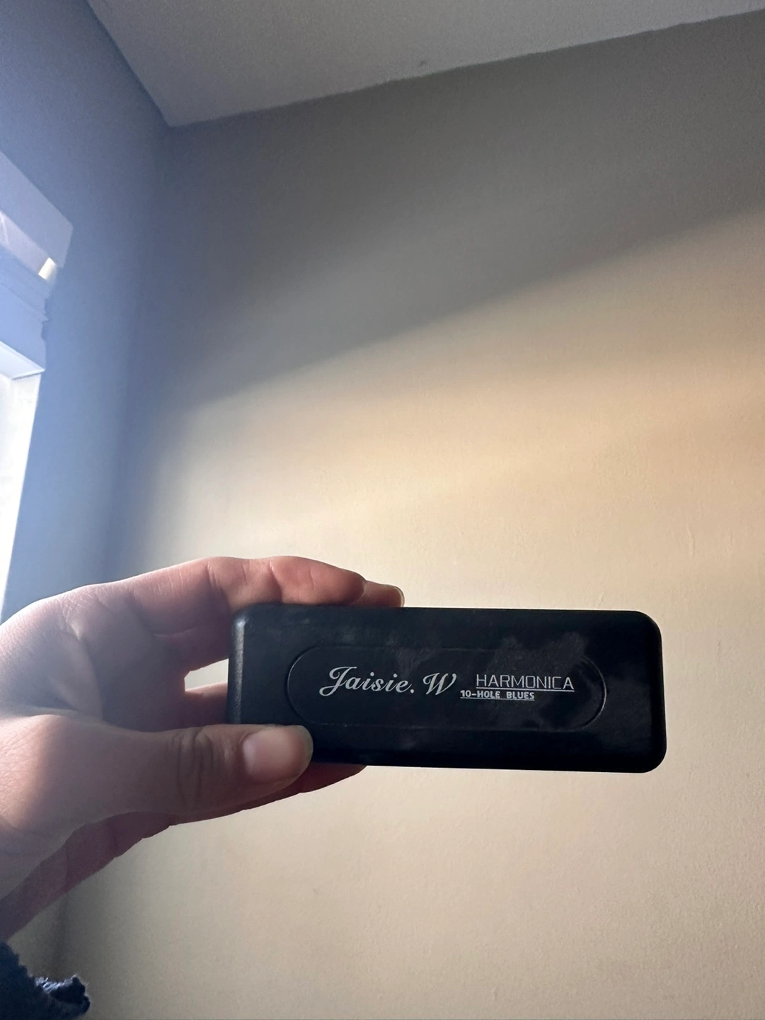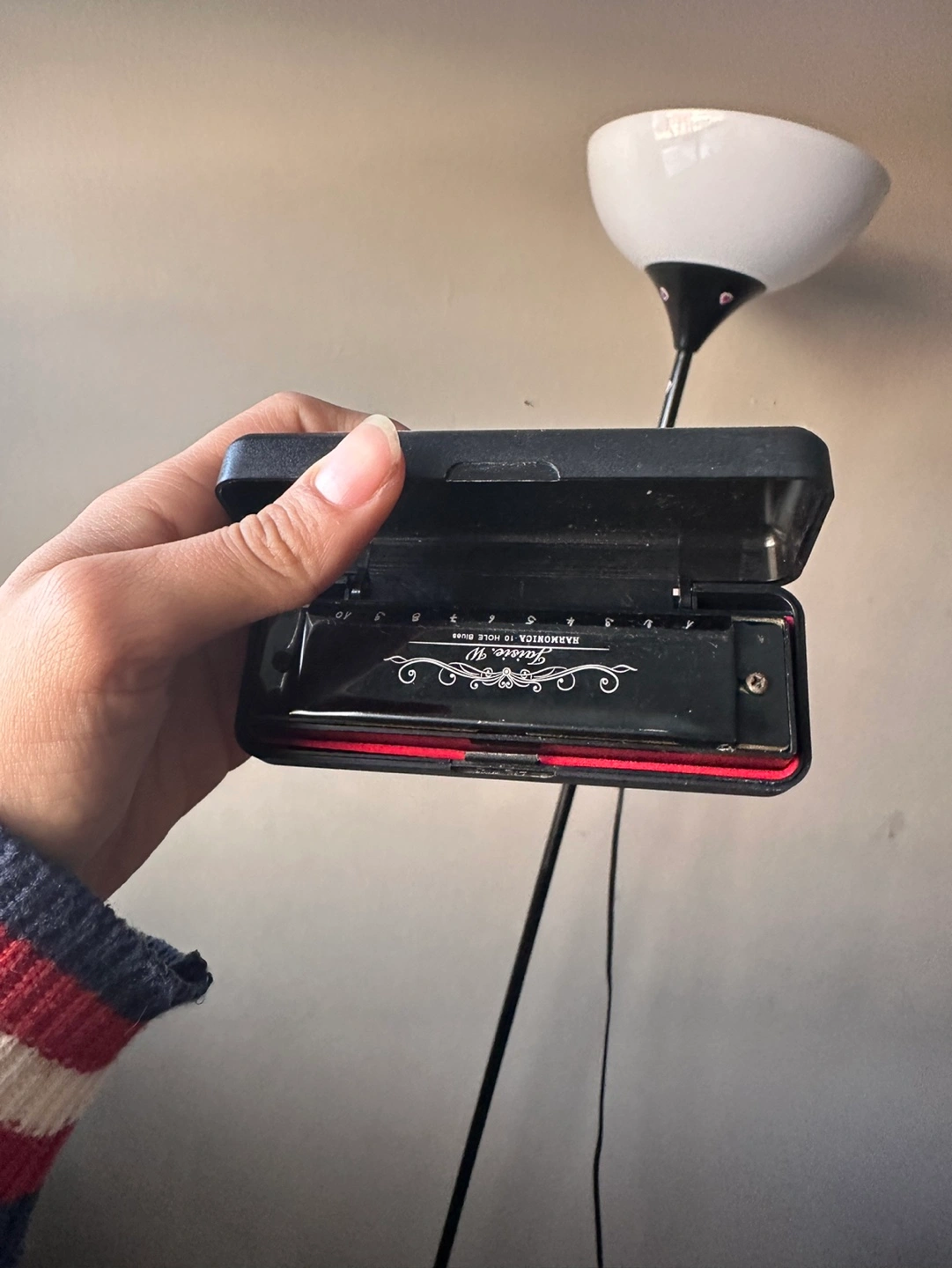 Black harmonica in a case with a red interior. 10-hole, good condition.
