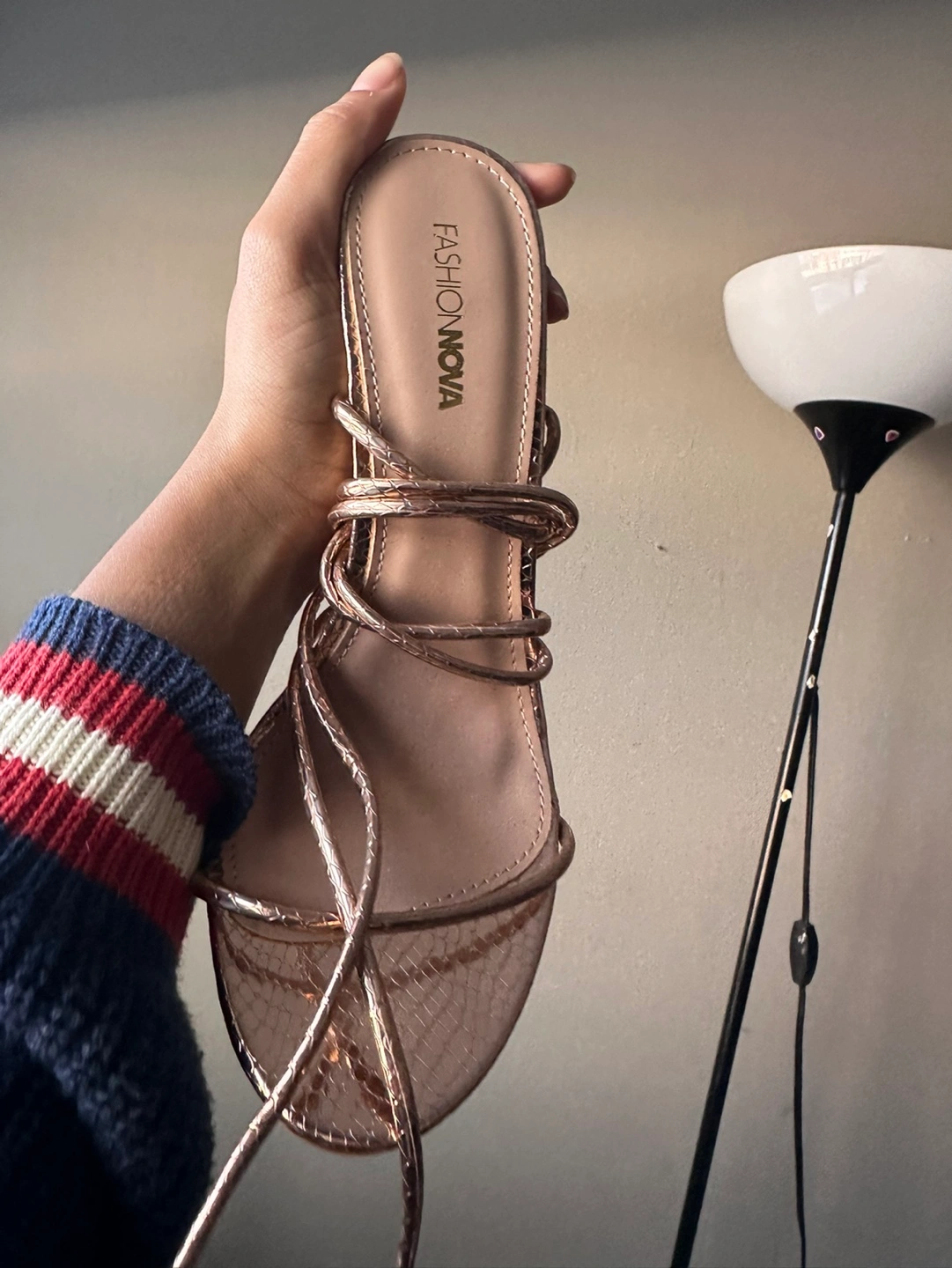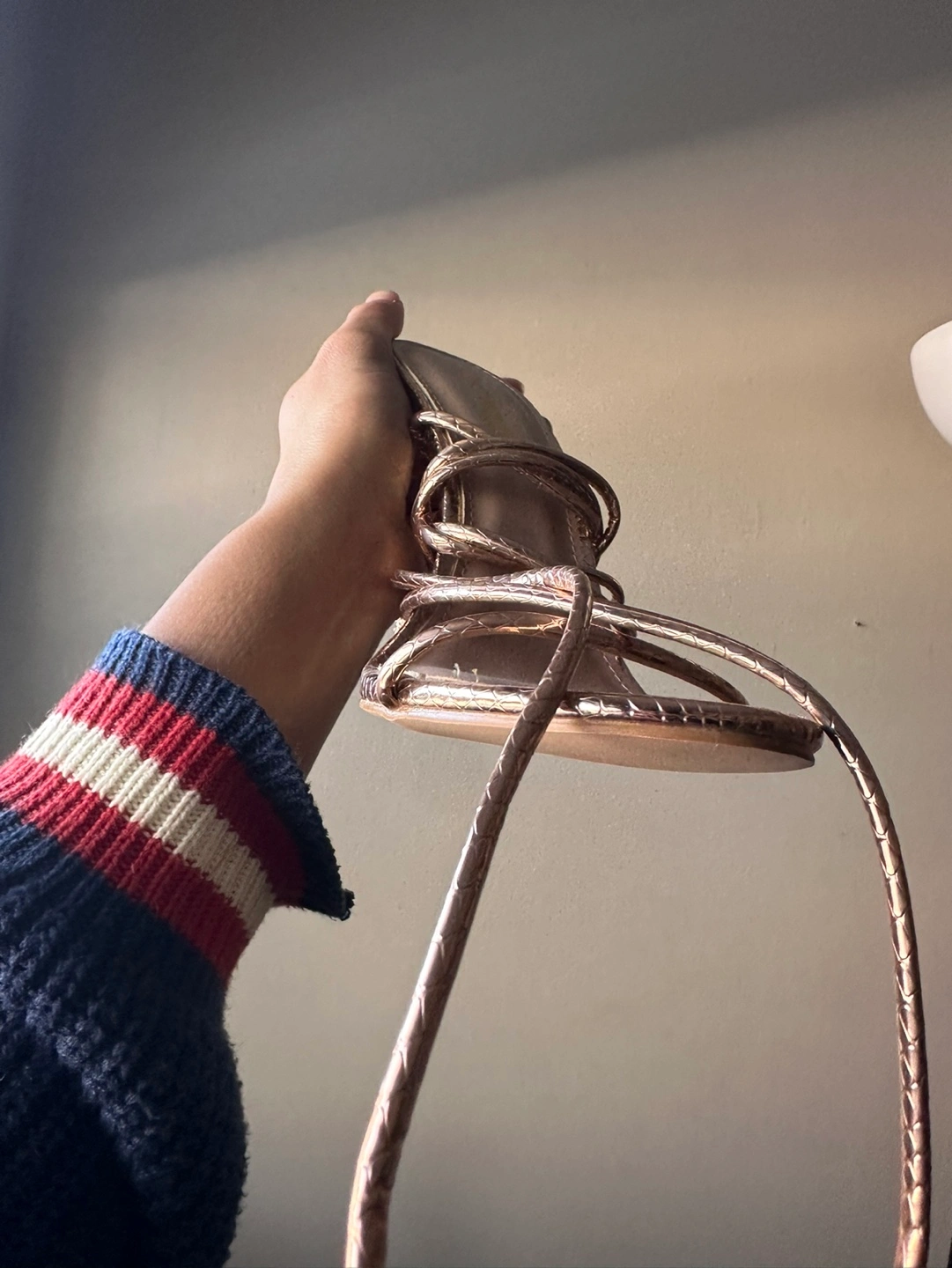 Never worn. Rose gold sandals with snake skin pattern. Lace up style. Heels. Size 8.5.