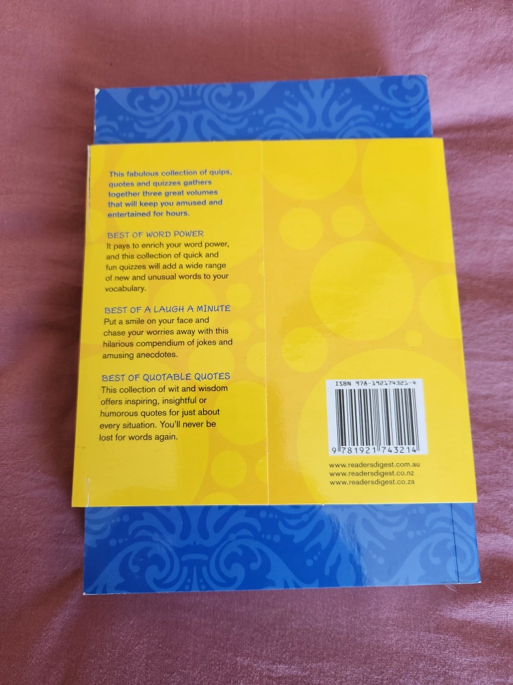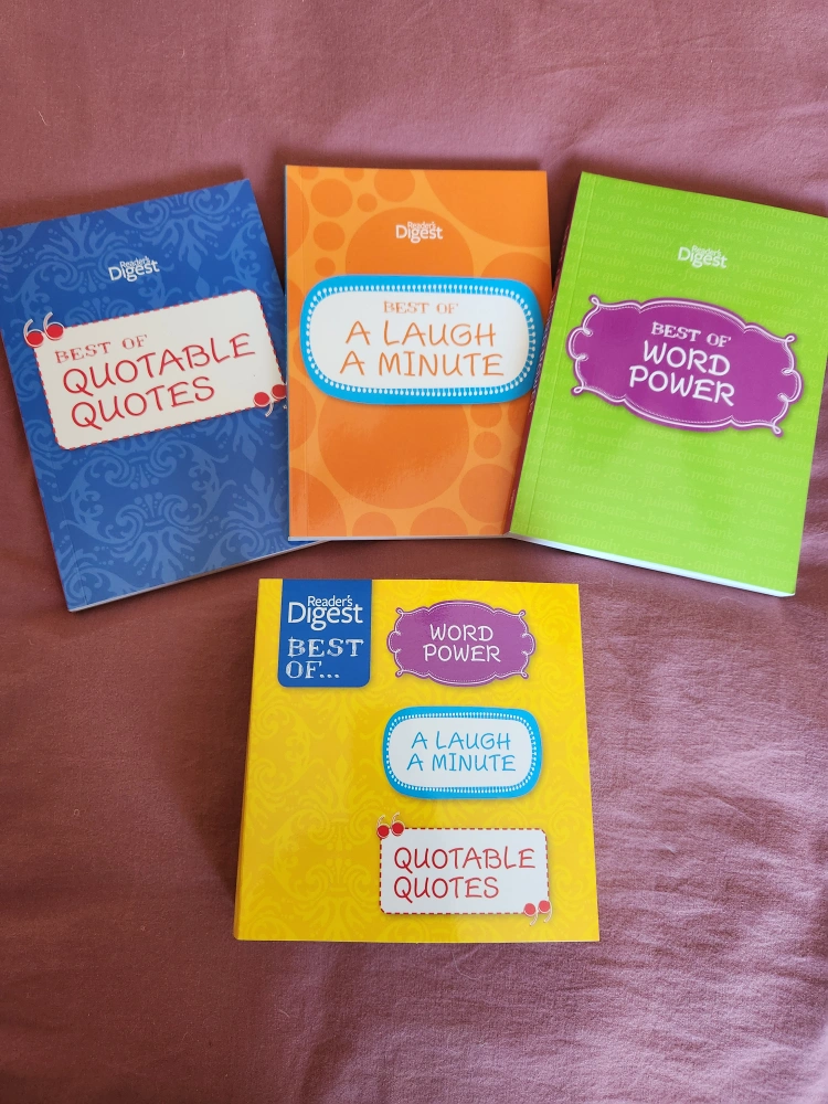 Set of three Reader's Digest books: Best of Quotable Quotes, Best of A Laugh a Minute, Best of Word Power. Includes fun quizzes and a wide range of new and unusual words to your vocabulary.