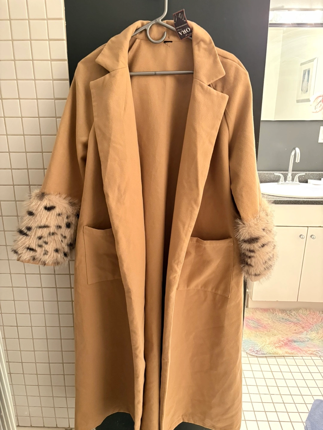 Brand new Long camel coat with faux fur trim on the sleeves. Features two pockets.