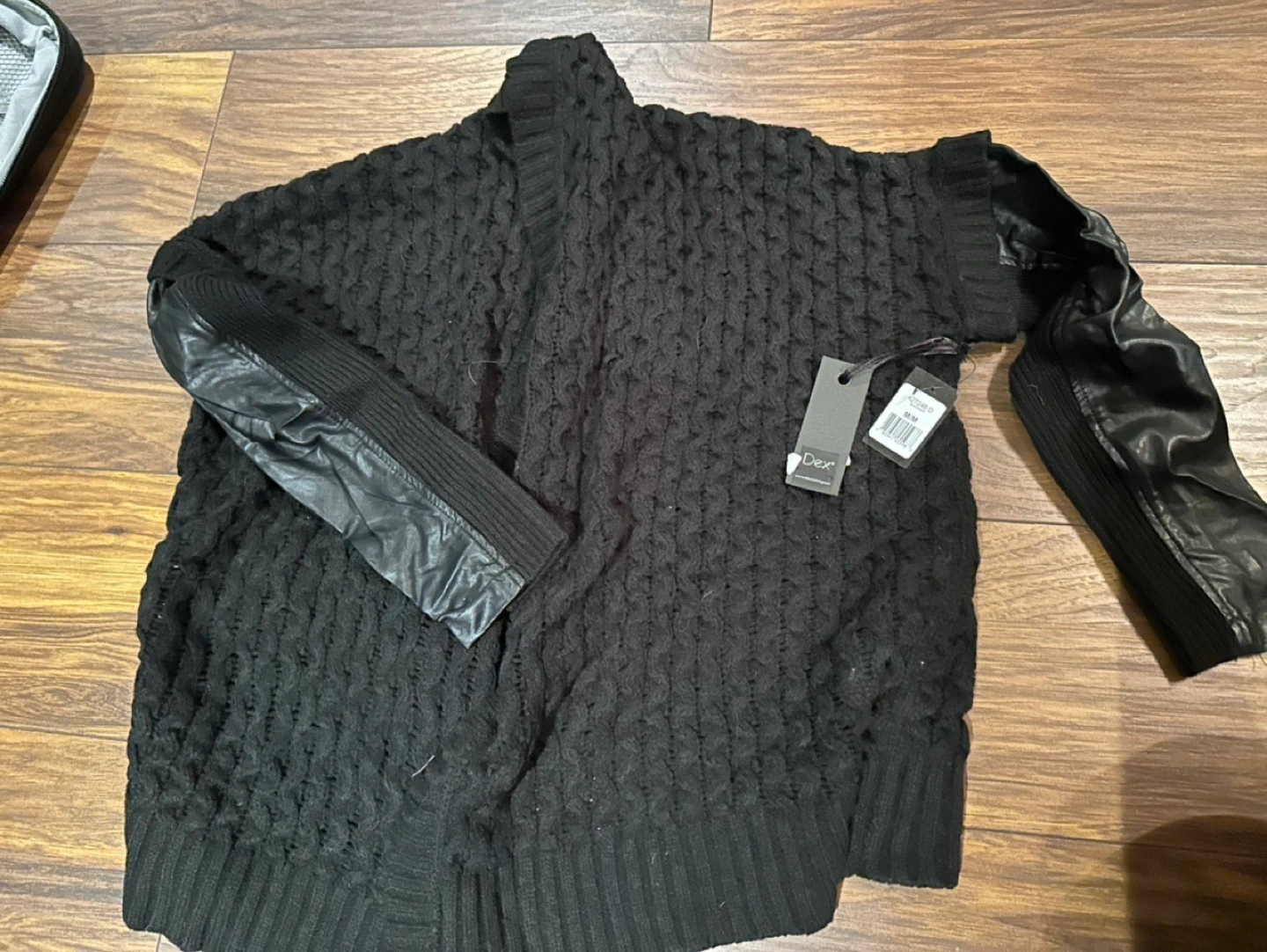 Black cardigan with leather sleeves. Long sleeves, open front. Knitted fabric. Brand tag attached.